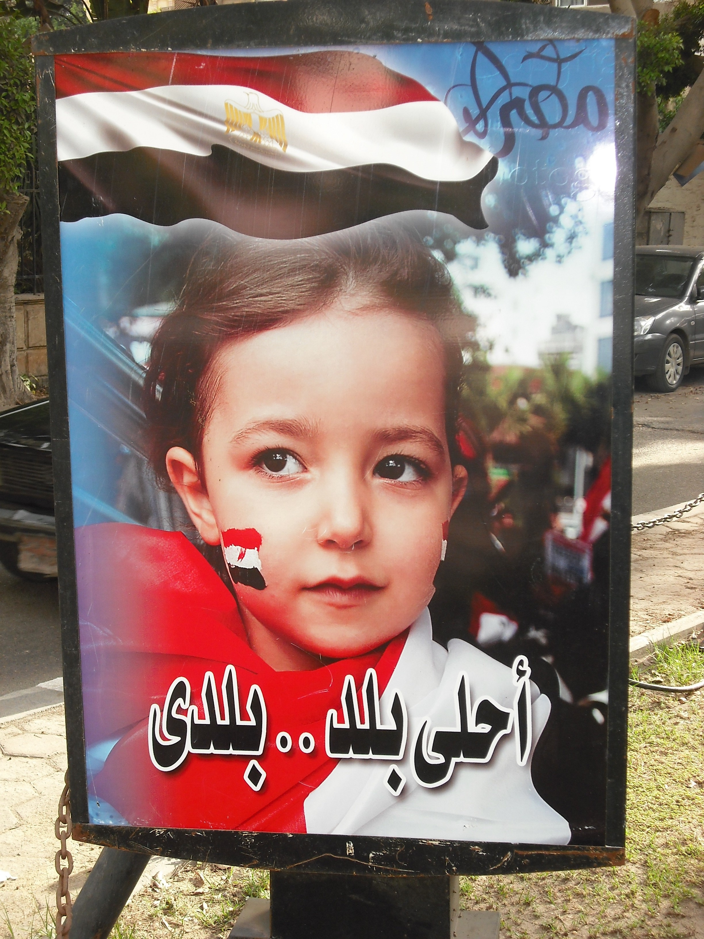 פוסטר שהופיע בקהיר לאחר המהפכה. ילד עם ציור הדגל המצרי על לחיו. הכיתוב אומר: "הארץ היפה ביותר – הארץ שלי".