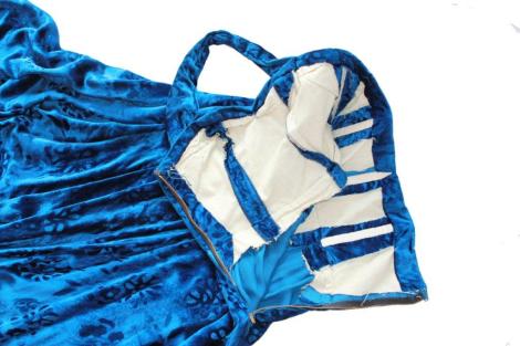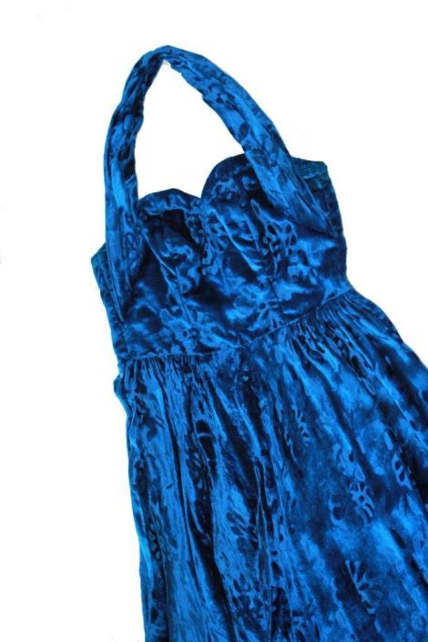 שמלת הקטיפה הכחולה של סבתא שלי היא פריט וינטאג' בעל איכות יוצאת דופן: חומר הגלם הייחודי והתפירה המוקפדת הופכים את השמלה לבגד משובח במיוחד. הבד, קטיפת משי כחולה מעוטרת בדוגמת פרחים, נשלח מהדודה בלונדון כמתנה לחתונה של סבתא וסבתא בשנת 1949. כמה שנים לאחר מכן, הזוג הצעיר הוזמן לאירוע, מסיבת ערב ראש השנה האזרחית בבית מלון דן החדש בתל אביב. כל ה'חברה' הגיעה, וקוד הלבוש היה 'עניבה שחורה', ושמלות ערב ארוכות לנשים. סבתא מצאה את הדוגמה בעיתון: שמלה עם גב פתוח, כתפיית עורף, חצאית עשירת בד. את החזייה בנתה התופרת בתוך השמלה. כשהשמלה הייתה מוכנה, התופרת הוסיפה לה גם רדיד מאותו הבד, וכדי להגשים את חזונה של סבתא, סבא הלך בכל העיר וחיפש פרנזים שחורים תואמים, שנמצאו ונתפרו במכפלת הרדיד. הייתה לשמלה גם תחתונית מעומלנת כדי שהחצאית 'תעמוד' תפוחה וחגיגית.