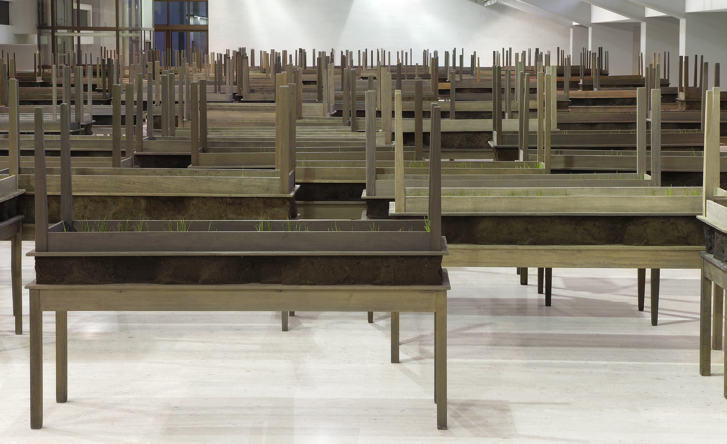 בתערוכה החדשה היא מצליחה ללוות את המבקרים אל מחוזות הסבל והמוות של קולומביה, שם חיילי הצבא הרגו בין השנים 2003 ו 2009 אלפי אנשים צעירים תמימים באמתלה של ציד חיילי מיליציות. כמו כן, האמנית חקרה את תופעת מלחמת הכנופיות האכזרית של יוצאי קולומביה ודרום אמריקה בלוס אנג'לס. המייצג שיצרה האמנית באולם המוזיאון המעוקל בנוי מאוסף של שולחנות בית ספר הפוכים זה על גבי זה, ומתוכם בוקעים ומניצים עלי דשא ירוקים. מעביר בדרך שקטה את האובדן והאבל וגם מצליח להעניק תקווה מאופקת בדמות צמחים שבריריים הצומחים מתוך מצע לוחות העץ מהם עשויים השולחנות.