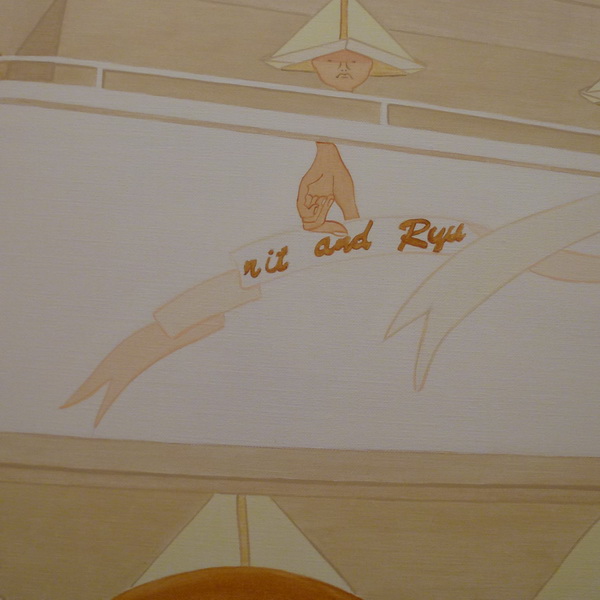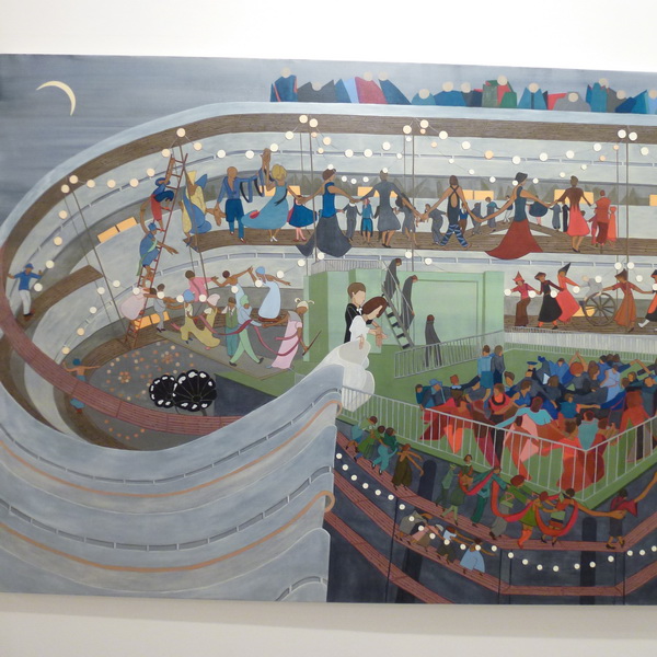 בעבודה נוספת הרוקדים בבנין מזכירים לי נשפים על אוניות, נורית מסכימה לפרשנות ואומרת שבנייני העיר נקראים ״בתי האוניה״. הבניין מצויר קומות קומות ובכל קומה רוקדים בבגדים מוקפדים וצבעוניים. בכלל, אצל נורית הצבעוניות משכרת הבניינים יוצאים במחולות ונדמה שהשמחה שורה בכל.