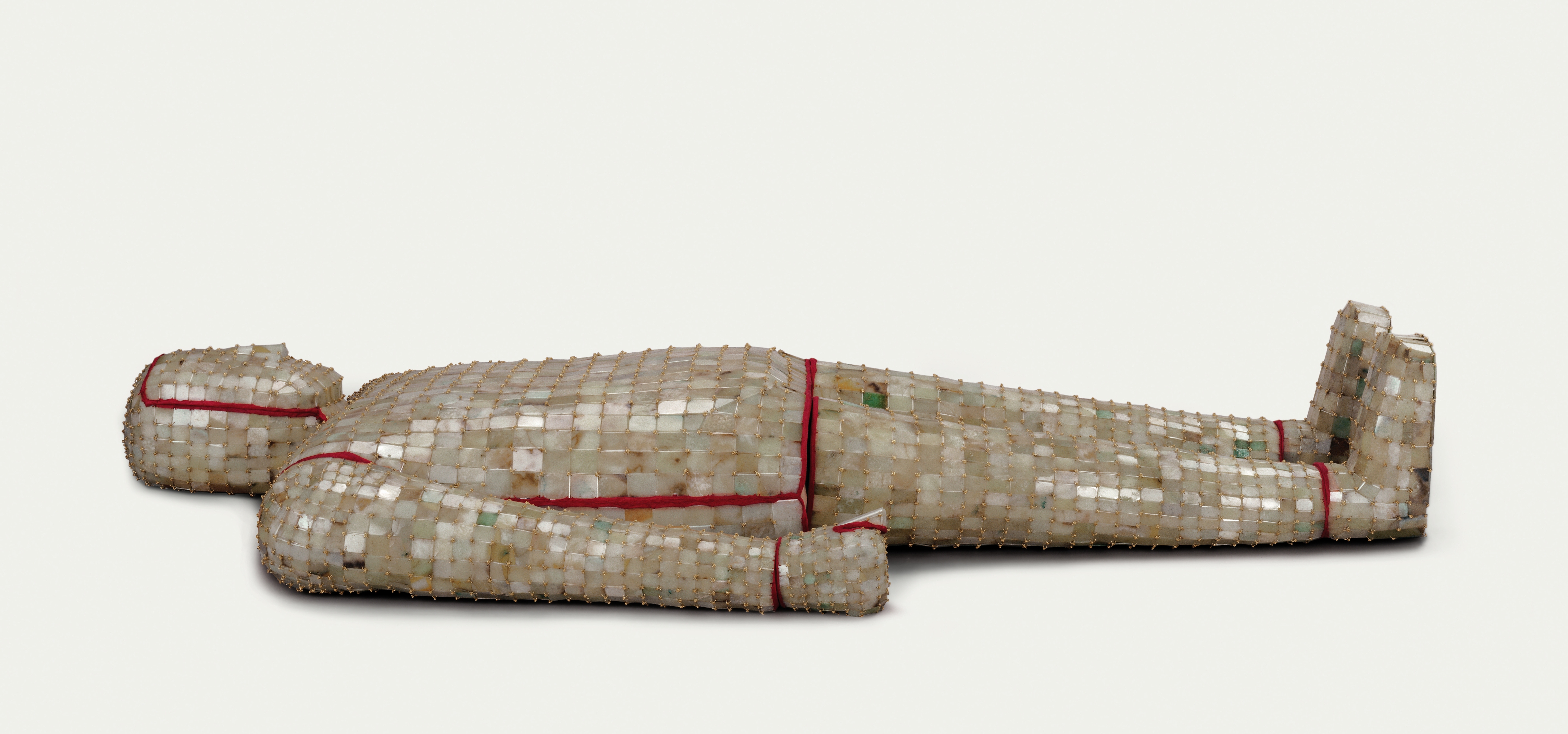 אחד המוצגים המשמעותיים ביותר בתערוכה, שחושפת את המסתתר בתוך בתי הקבורה המפוארים של שליטי האימפריה, הוא בגד המוות של הקיסר, העשוי אלפי פיסות אבן ירקן מסותתות ומחוברות בחוט משי. זוהי מעיין גרסא מתוחכמת של תכריכים, שלא נועדה לשמר את הגוף המת כמו להגן עליו מפני שדים ושטנים. הבגד העניק לקיסר גוף מלאכותי ומפואר שישמש את המת בחיי הנצח. זהו פאזל של אבנים חלקלקות, ה'תפורות' זו לזו בחוט משי זהוב או אדום, בהתאם לחשיבותו של המת. בגד הירקן נשתמר באופן מושלם עד לימינו, כמו מוזאיקה מבריקה ומינימליסטית.