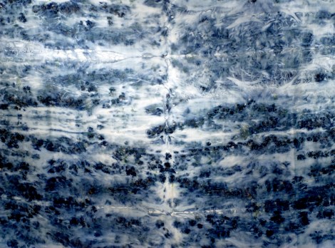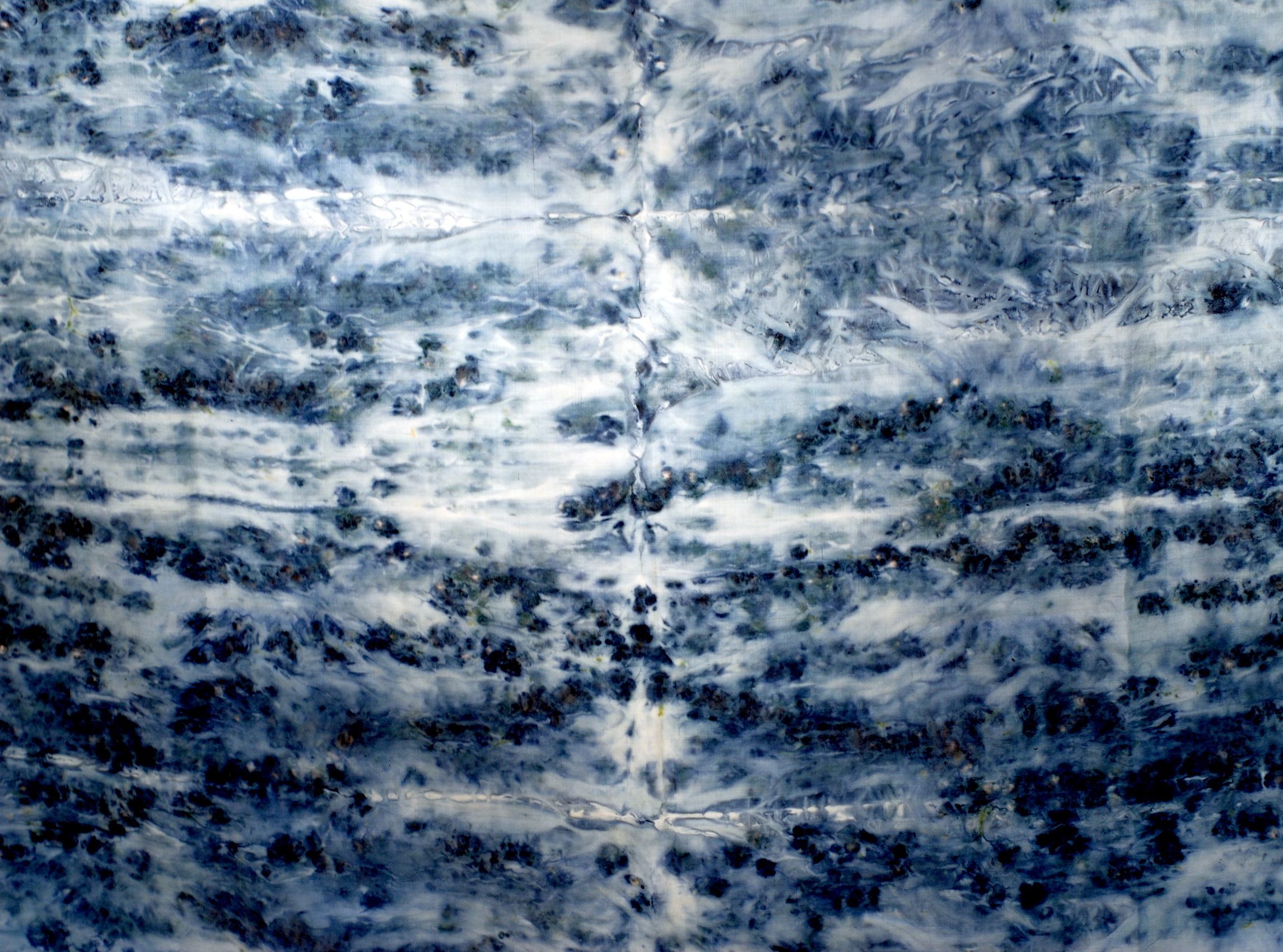 שמי הכפר הפתוחים והרחבים, חפים מגגות הבניינים ומחוטי חשמל, מעודדים את המתבונן לשכב על העשב הירוק ולהביט בעננים. שעות ילדות ארוכות ועשירות בזמן עברו בהתבוננות חולמנית בעננים החולפים והמשתנים ללא הרף, ובגילוי דמויות וצורות בין הכתמים הלבנבנים. הענן הוא הצורה האבסטרקטית המיידית ביותר בחיי היומיום, כמו כר רך המשמש מצע נוח למחשבות וזיכרונות אישיים. בד המשי מכוסה בכתמי פירות עסיסיים בגוון כחול עמוק, כמו שמי חורף מלאים ענני סערה. התבוננות עמוקה חושפת צורות חמקמקות וכתמים אקראיים שהופכים תחת עינינו לרגע של חלום. כמו צורתם המקרית של העננים המתערבלים בשמיים, גם כתמי הטבע שנותרו על הבד מזמינים לחלום על רגעים שחלפו בעודנו מתבוננים בהתחדשות המתמשכת של הטבע.