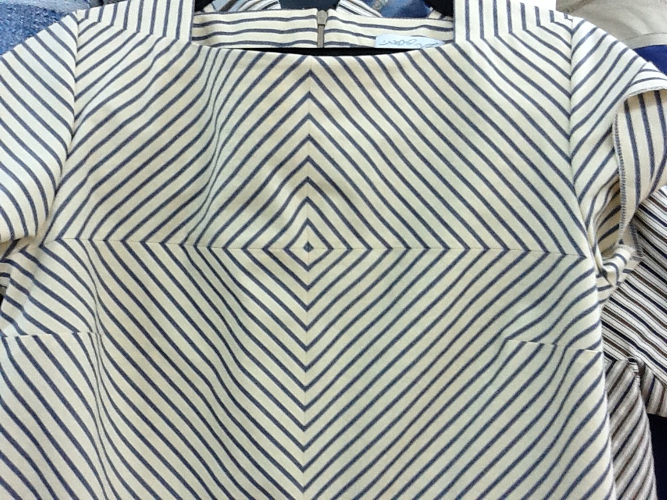 במהלך ההמתנה לבדים עבדתי על תפירת אריגי כותנה בפסים שונים בחלוקות גרפיות מדויקות האפשריות אך ורק בתפירת הוט קוטור. יצרתי חלקים עליונים בהשראת בגדי מלחים.
