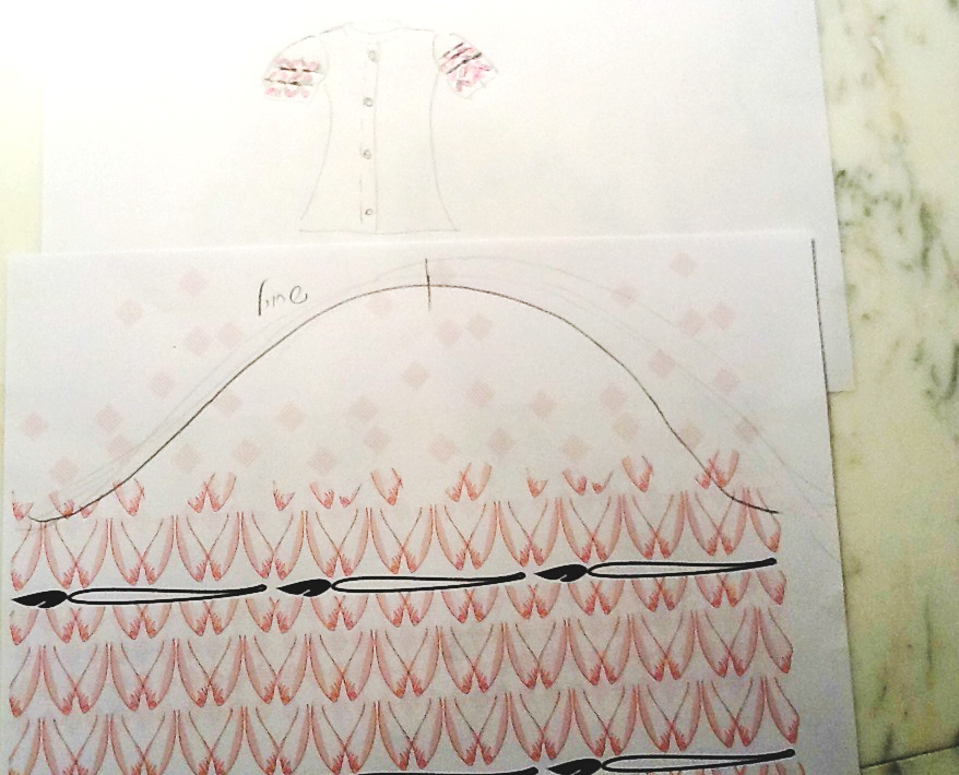 יש בציורים של נורית ילדה נוכחת ונעלמת, דמות מסתורית אבל מעוררת רגש עדין. אני גוזרת חולצה קטנה עם פתח צוואר מעוגל ששרוולים הקצרצרים והתפוחים הם מצע להדפס יפיפה שנורית מאד אוהבת ובו שורות כפות ״רגלי בתולות״ המודפסות בגוון ורוד ענוג, ומכחולים כחולים חוצים אותם. לחולצה הזו בחרתי כפתורים בגוון אפור שקניתי פעם בדוכן רחוב בפריס ומשלימים לדעתי את התחושה העדינה והקלאסית של הילדות המבוישת.