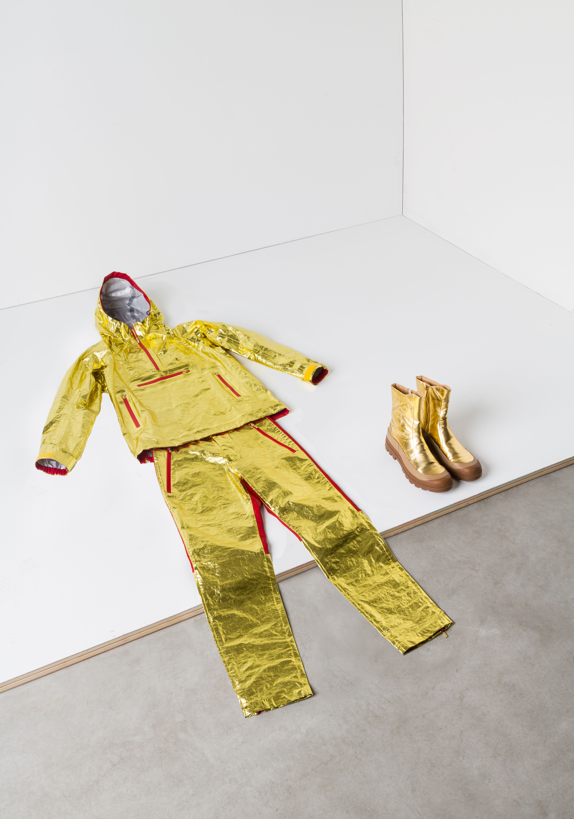 בתערוכה מוצגים ארבעים "בגדי עבודה" שעיצבו מעצבי אופנה מובילים כמו איסי מיאקי, ויויאן ווסטווד, אנג'לה מיסוני, אנטוניו מאראס ועוד. חלק מהמלבושים מתאימים לעבודות יוצאות מגדר הרגיל (כמו לוכד עננים) וחלק לעבודות רגילות למדי, כמו מגדלת גזרים. הבגדים מזמינים לחשוב מחדש על האופן שבו הלבוש שלנו נתפש בעיני החברה. חולצת הוואי, סנדלי אצבע, כובע בייסבול לבן ומחשב מק הם ה"חליפה העסקית" של העובד הפוסט-תעשייתי (או, כמאמר המעצב אנדראה בראנצי, העובד ה"פוסט-פורדיסטי"). האם החברה מתייחסת לעובד כזה בפחות רצינות מאשר לעובד בחליפה או בסרבל עבודה כחול?