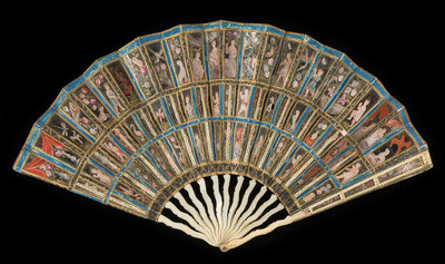 The Messel Mica Fan. Folding fan, the leaf composed of three bands of mica panels, mounted in double paper, painted in bodycolour and gilt. Ivory sticks of serpentine form; guards of ivory, the lower part serpentine, the upper part pierced by three panels backed with mica mounted in paper. Brass rivet. Front. The mica panels are painted in colours with different motifs including: floral sprays, flowers in vases, flowers with a bird, flowers with a dog, a dog with a bird, a bird with a dragonfly, a butterfly, a boy with a butterfly, a boy playing a pipe, a Cupid holding a heart, a Cupid brandishing an arrow, a seated boy, a female bust; some occurring more than once, but not identically. The horizontal paper borders between the panels are painted alternately black and blue with gilt ornament. Height (guards) 25.8 cm, width (whole) 45.0 cm, circa 1665 to 1700. Production Place: West Europe.