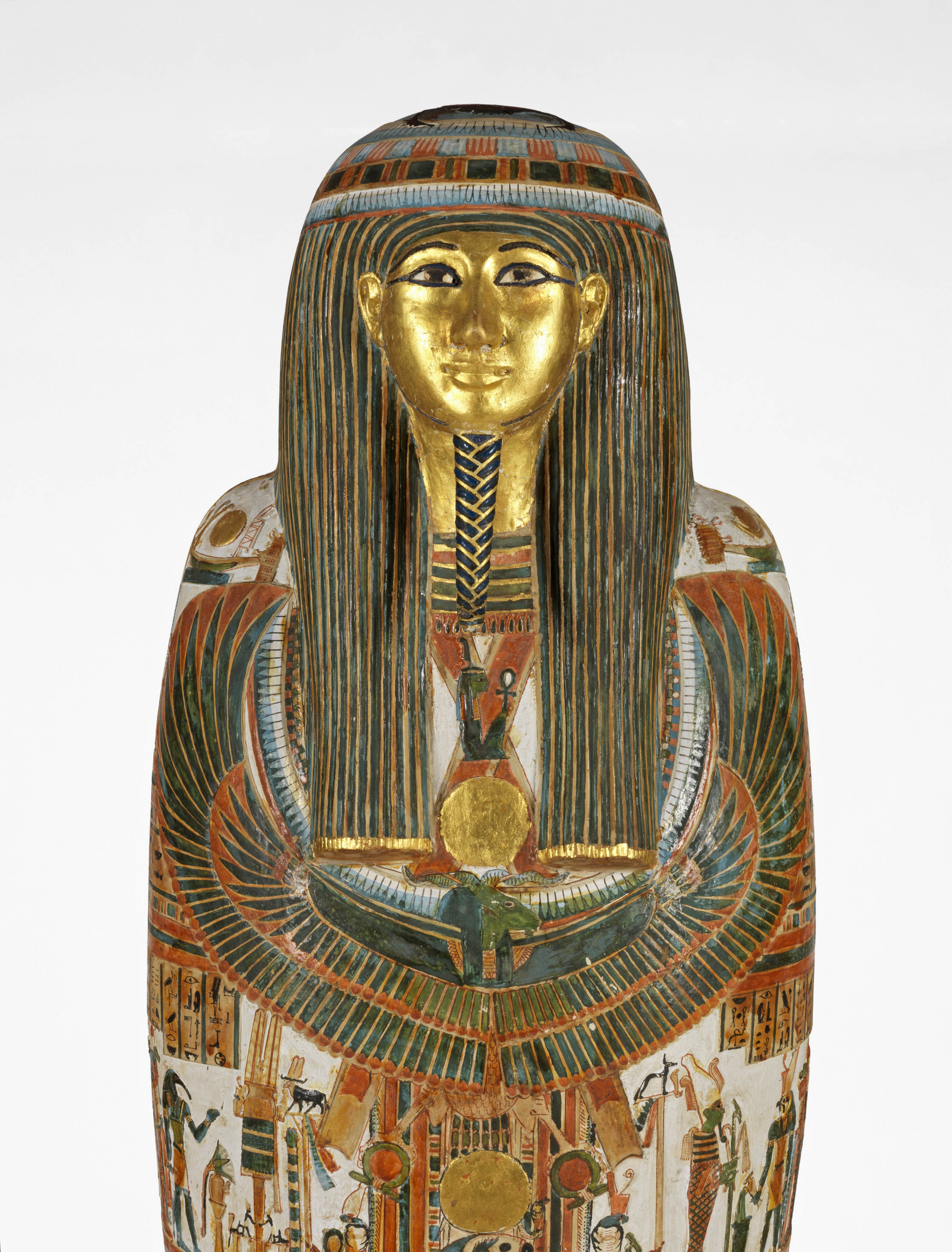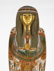 Funerary equipment. Coffin, of a priest in Karnak, Nakhtefmut. The mummy case is a moulded, hollow shell, with a slit up the back. After the mummy was inserted, the slit was laced together and a board inserted under the feet. Find Spot: Ramesseum Thebes, Egypt. Painted wood, cartonnage, depth 33 cm, height 177.5 cm, width 44 cm,, 924- 889 B.C. Twenty-second Dynasty, Third Intermediate Period.