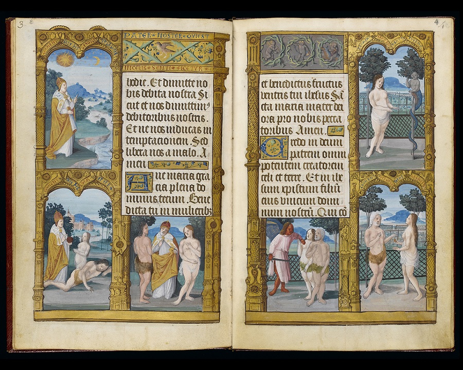 Decoration: miniatures 2 full-page, 36 smaller; ornamental initials illuminated in blue or red on gold background with floral decoration; identical line-fillers; borders with architectural frames, birds, animals, flowers and vines, mottoes and captions