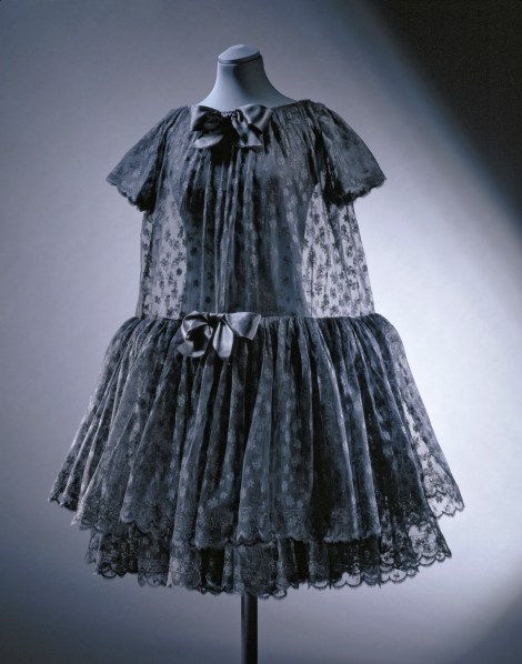 Evening dress, tiered machine made lace layered over silk with satin bows;