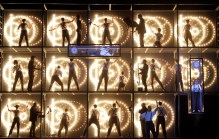The ensemble in "Spaceship" at the dress rehearsal of Philip Glass' "Einstein on the Beach" in collaboration Robert Wilson at the Dorothy Chandler Pavilion in Los Angeles on Oct. 10, 2013. Los Angeles Opera's presentation of the Philip Glass and Robert Wilson "Einstein" represents more than 25 years of efforts to bring the ground-breaking 1976 opera to L.A. (Photo by Lawrence K. Ho/Los Angeles Times via Getty Images)