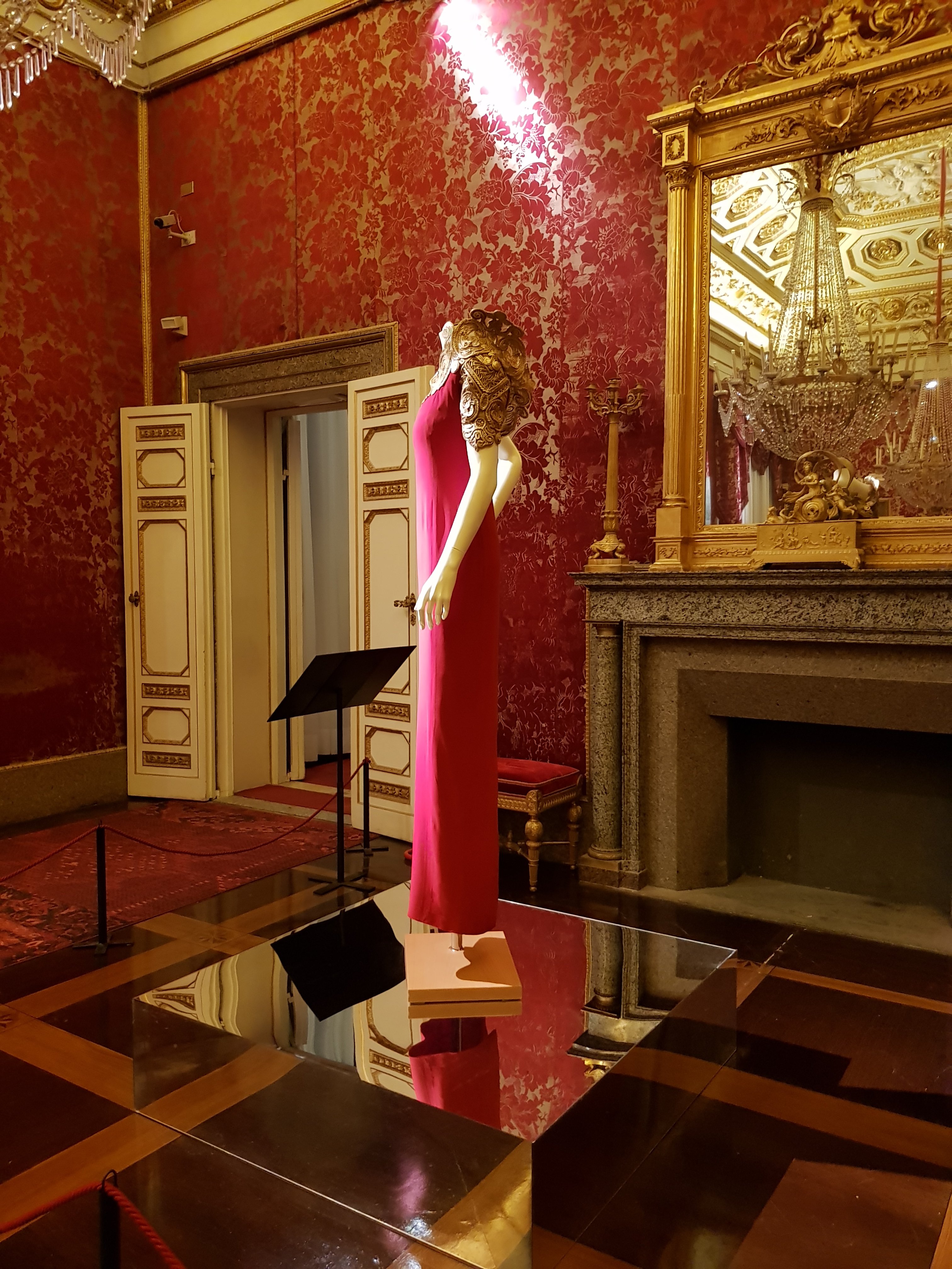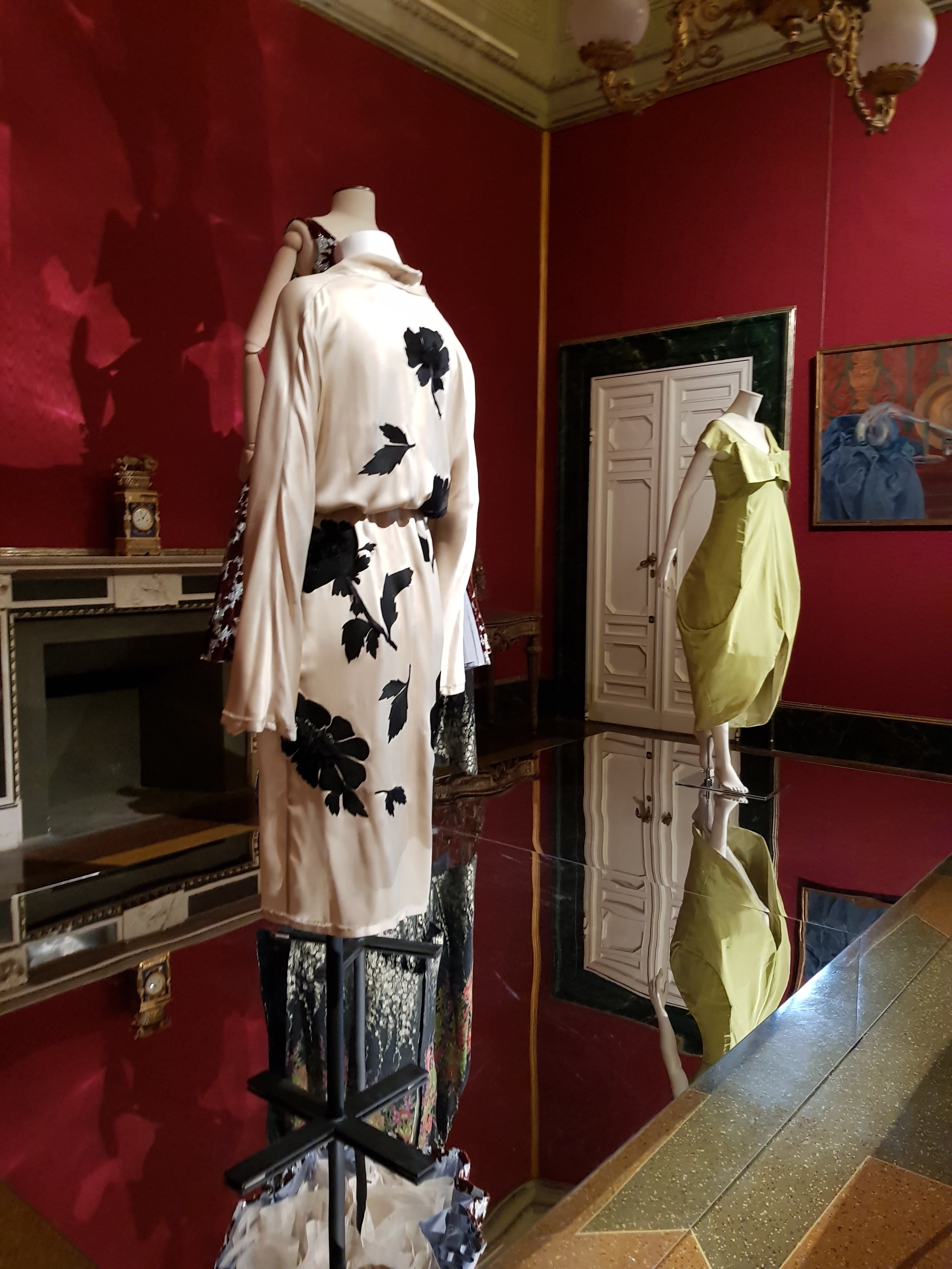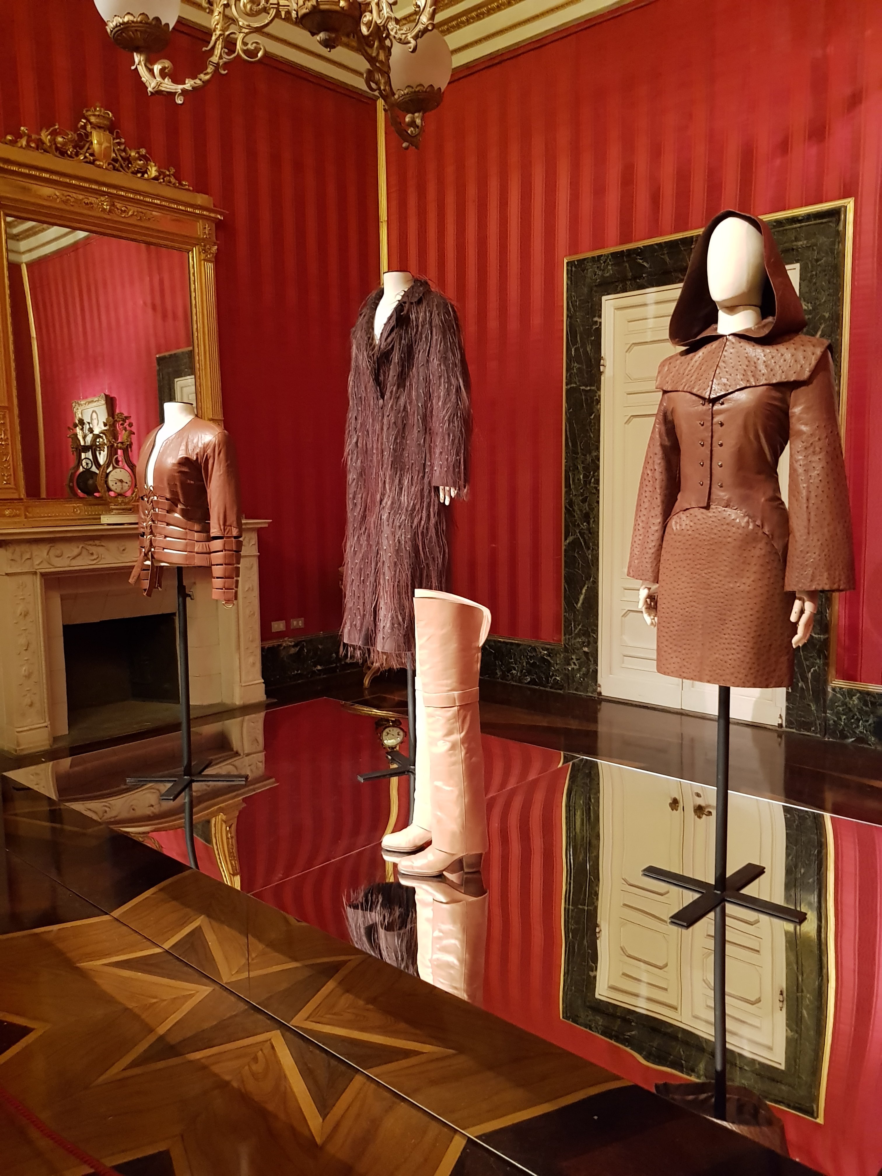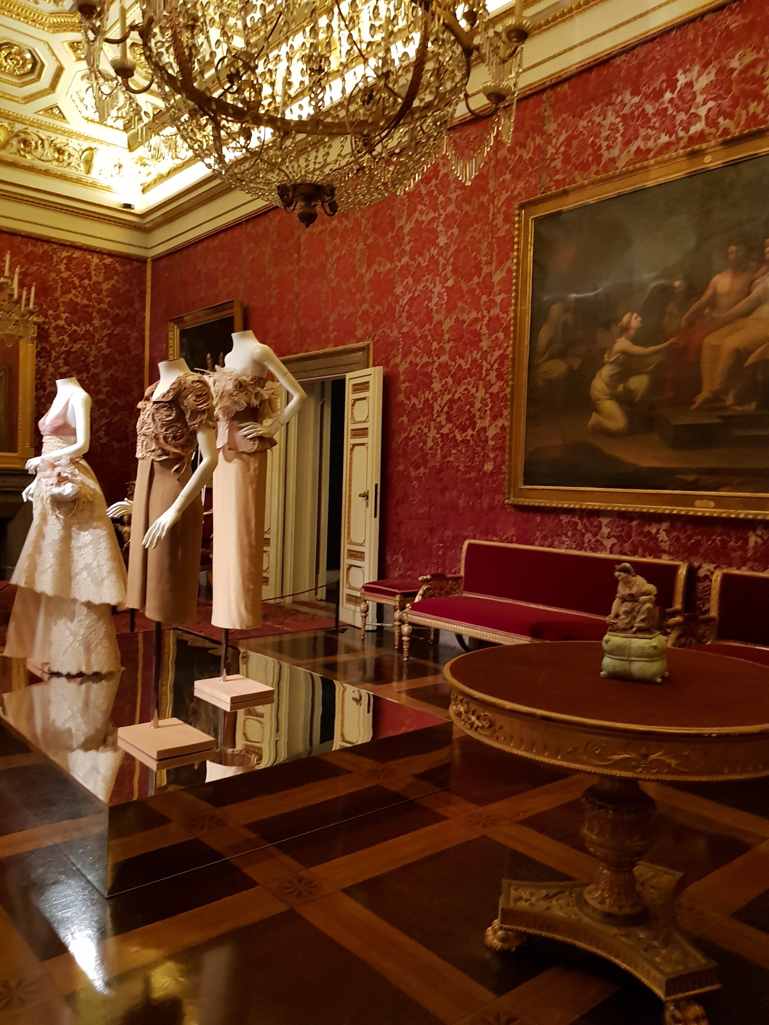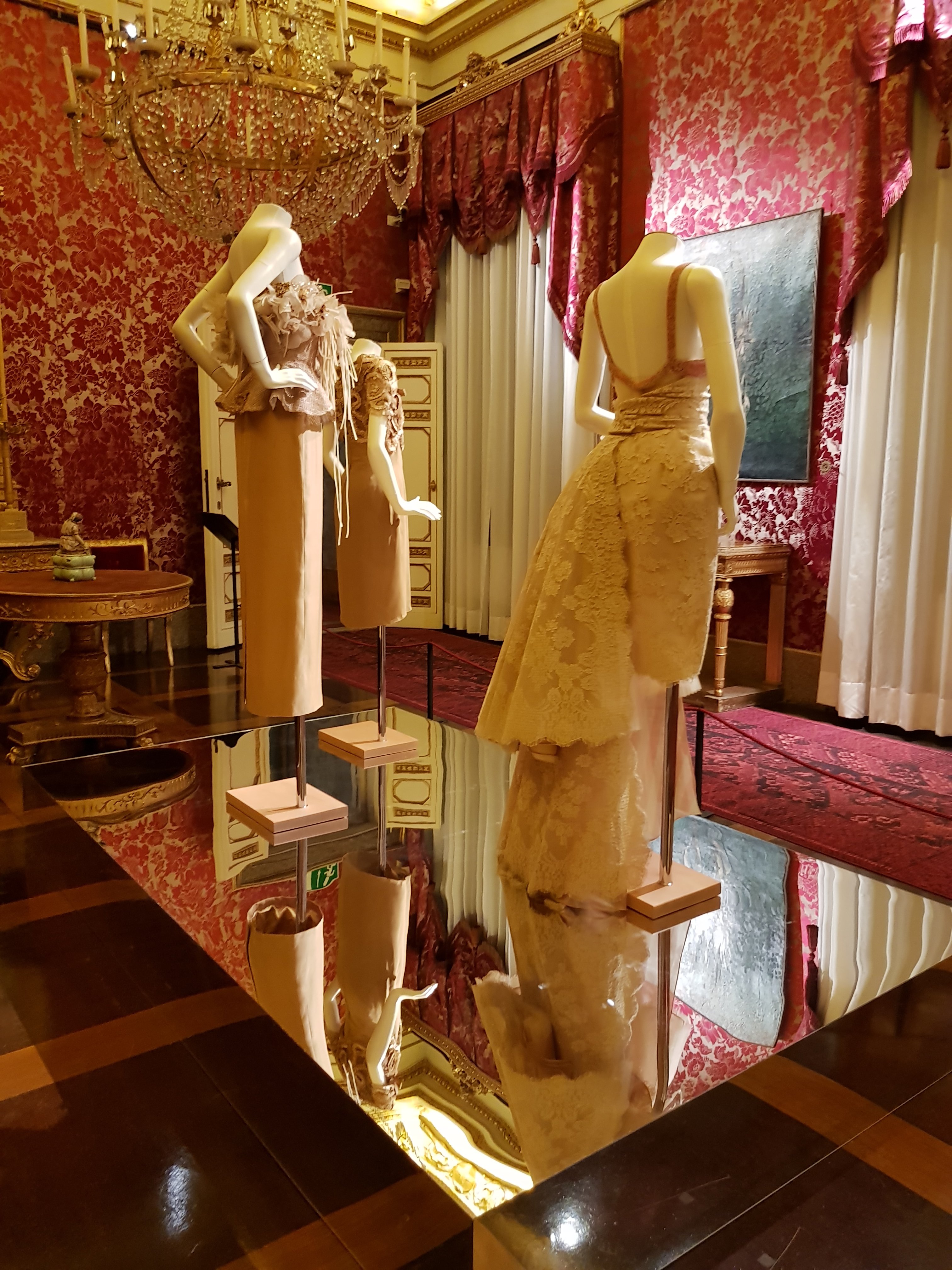בניגוד לתערוכות אופנה מודרניות, המוצגות בחללים המינימליסטיים והחדגוניים של מוזיאונים גדולים כמו מומה בניו יורק או המוזיאון לאמנות דקורטיבית בפאריז, פה הבגדים מוצגים בתוך החדרים המפוארים והמרשימים: ציורי קיר, טאפטים ממשי, שטיחי קטיפה ורהיטים מהודרים ממלאים את חלל המוזיאון ומתחרים בשמלות. למרות החשש הראשוני, המוצגים לא נעלמים בחלל, אלא דווקא משתלבים בעושר היצירה האנושית ומתגברים כך על הסטריליות של המוזיאונים המודרניים, שקירותיהם צבועים לרוב בשחור או לבן ׳נקיים׳.