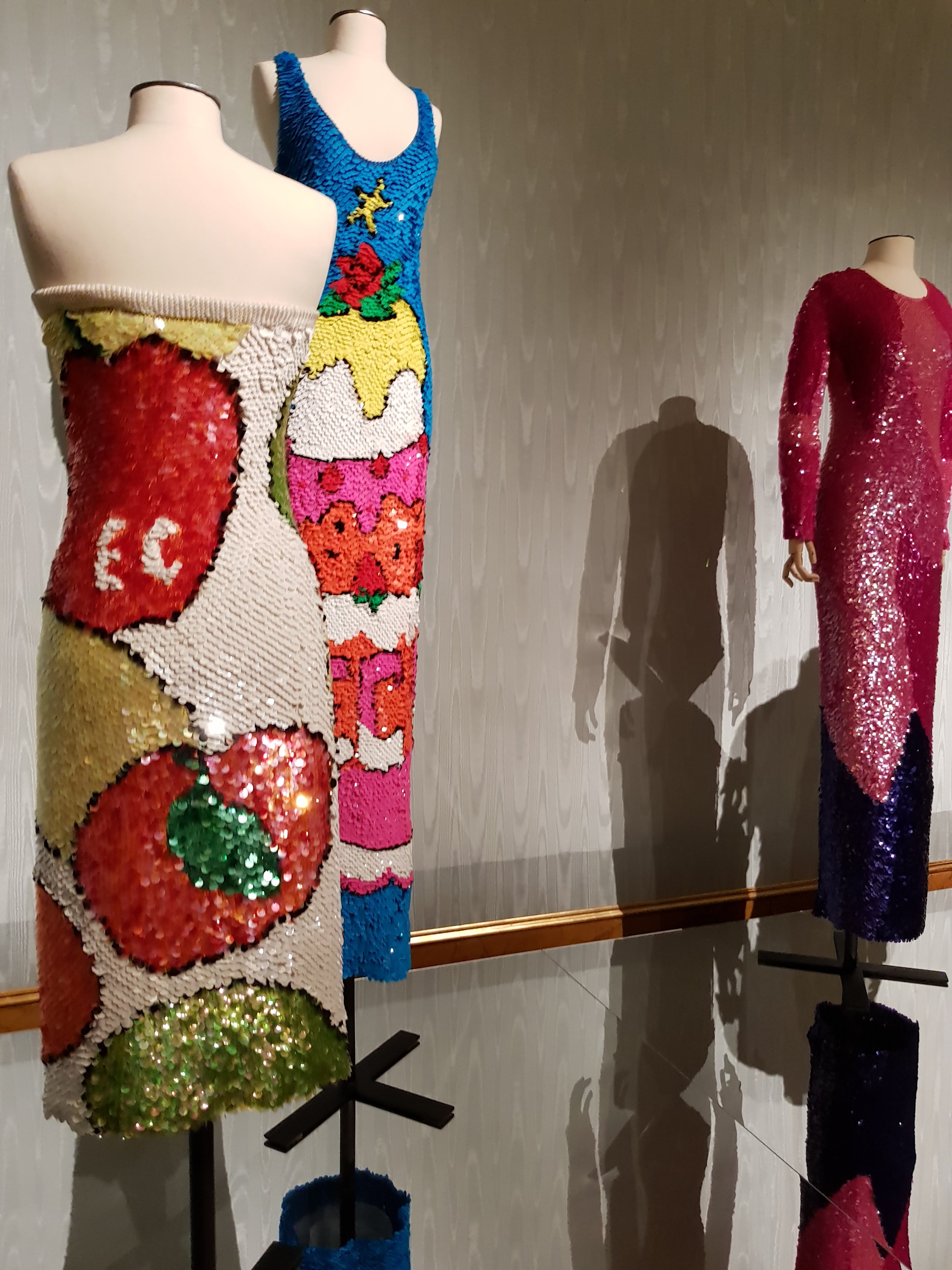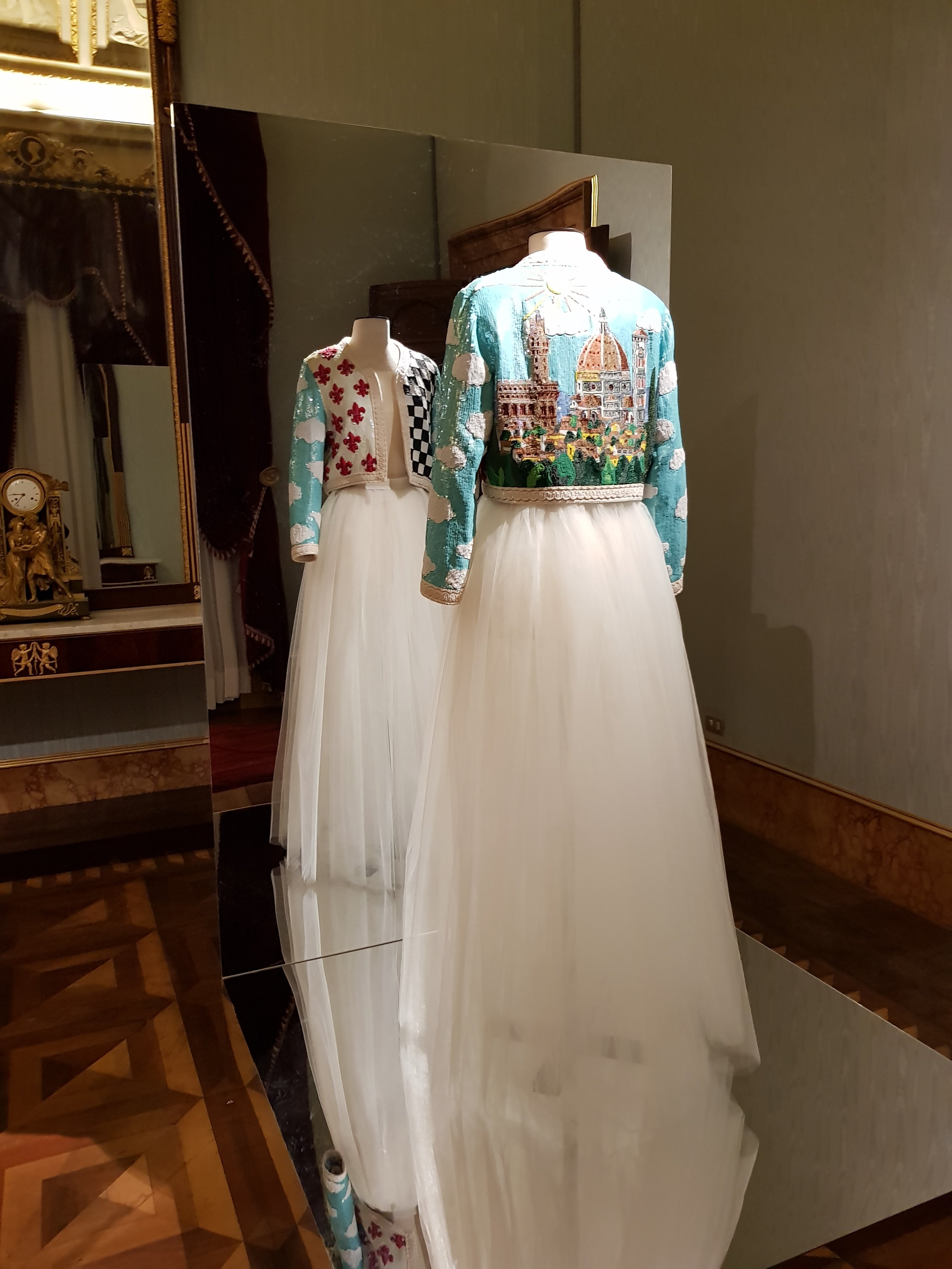 הפריט שמשך אותנו יותר מכל בתערוכה הוא בולרו של מוסקינו, רקום בפאייטים. מלאכת היד המרשימה שאיפשרה ליצור את הפריט הזה היא הבסיס להצלחת האופנה האיטלקית. הבולרו מציג, באירוניה משועשעת, רקמת פאייטים של נוף העיר פירנצה, הפרושה על הגב. הקדמי רקום בסמל העיר, פרח החבצלת האדום. והשרוולים רקומים שמים תכולים ועננים. ההומור והיכולת הטכנית המופתית הופכים את הבולרו הזה לתמונת המראה של שמלת ירושלים המביכה של מירי רגב. מה המסר? אולי אפשר ללבוש בגד ׳פטריוטי׳ אם הוא עשוי היטב.