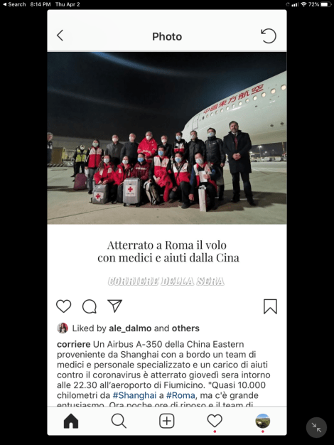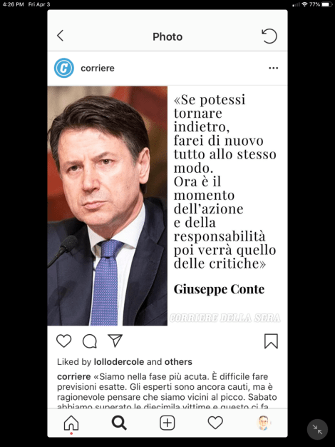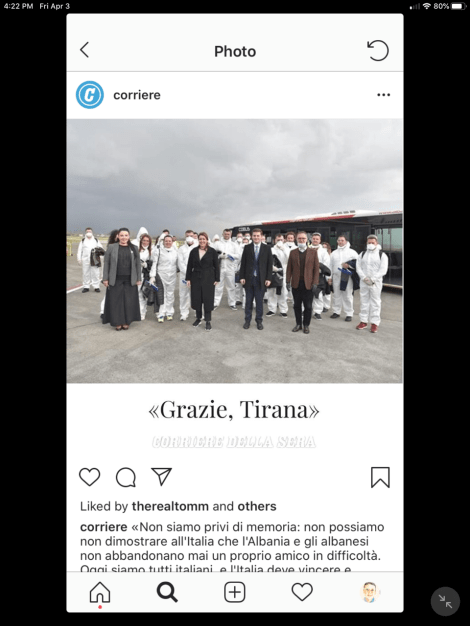 ראש ממשלת איטליה ג׳וזפה קונטה מנהל את המשבר באופן קר ורציונלי (אולי דווקא בגלל שאיננו נבחר ציבור אלא מינוי של שתי המפלגות הגדולות שלא הצליחו לבחור ראש ממשלה). הוא קיבל החלטה לא פשוטה לשתק את המדינה כולה ואת הכלכלה כדי לעצור את התפשטות הוירוס שנראה שיצא משליטה. אך מדינות האיחוד האירופי, בחלקן בעלות כלכלה חזקה כמו גרמניה והולנד, מפנות כתף קרה ומתעלמות מהקשיים ומצוקת המערכת הרפואית האיטלקית. נשמעים קולות כמו …״לא נשלם את החובות האיטלקים…״ או תלונות שפקידים איטלקים מרווחים יותר מעמיתיהם ההולנדים לכן אין מה לעזור להם. קונטה מבהיר שהסולידריות שהוא מצפה מהאיחוד היא על בסיס ההסכמים לערבות הדדית ולא נדבה לכיסוי חובות, אך אפילו ג׳סטה קטנה לא מגיעה ממדינות כמו שבדיה, דנמרק או נורווגיה. קשה לפספס, לעומת זאת, את הצילום של מטוס סיני שנחת ברומא לפני כשבוע והביא צוות רפואי ועשרות טונות של ציוד רפואי או את קבוצת הרופאים הקובנים שמתמחים במגיפות וקבוצת החיילים הרוסים מומחים לטיהור בתי חולים. הרשים במיוחד הנאום מרגש באיטלקית של ראש ממשלת אלבניה (שהוא אמן במקצועו) שאמר שלא עוזבים ידיד בשעת צרה כשהוא מלווה צוות רופאים אלבנים שהגיעו השבוע לעזור לבתי החולים של בארי בדרום המדינה. פעם בארי הייתה יעד מבוקש למהגרים אלבניים עניים, ואילו עכשיו הם חוזרים אליה כרופאים נדרשים.