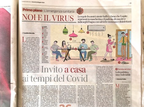 במהלך השבוע האחרון, אחרי חודשיים וחצי של סגר אזרחי כללי, ניתנה באיטליה לראשונה האפשרות לנסוע בין המחוזות השונים ללא הגבלה. במקביל הממשלה מפרסמת הוראות אזהרה המחייבות שימוש במסכות, חיטוי, ושמירת מרחק. גם בעיתון היומי התפרסם הסבר מאויר שממליץ על אופן אירוח חברים בבית. עד כה נראה שהאיטלקים מאד ממושמעים ומתנהגים בהתאם, ומצפים במלוא התשוקה לחופשת הקיץ.