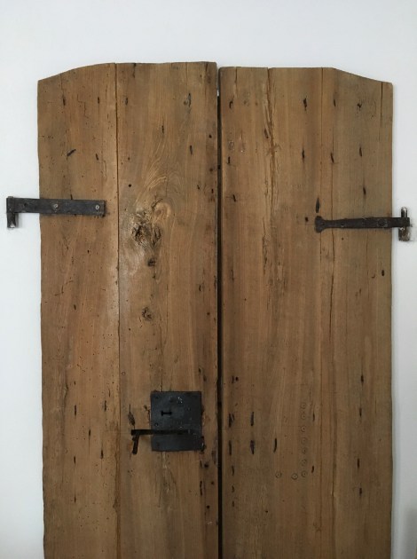 זוג הדלתות העתיקות דרכן נכנסים לסטודיו, הגיעו לפה ממחסן דלתות שנאספו מבתים וחורבות נטושות. פעם, במהלך העשורים מאז שנגר כפרי במאה התשע עשרה יצר אותן מלוחות עץ ערמונים, מישהו צבע אותן בירוק מבריק. אנחנו הסרנו את הצבע וחשפנו את יופיו של העץ הכבד והמלא. הן כמובן לא דומות לדלתות התעשיות החלולות המוכרות : הן אטומות לגמרי לרעשים חיצוניים. את פתח הסטודיו יצרו הבנאים בהתאם לדלתות, וציר ברזל מוקם בקיר. לדלתות יש בריחים מברזל בצורה שונה משני צדדיהן, מעשה חרש אמן. זו מלאכה עתיקה שהולכת ונכחדת: את הברזל נהג האומן לחמם ולרקע בפטיש כבד, וכך יצר את הבריחים והצירים לפי הזמנה, וכל זה הגיע יחד עם הדלתות.