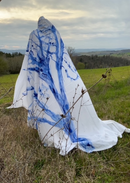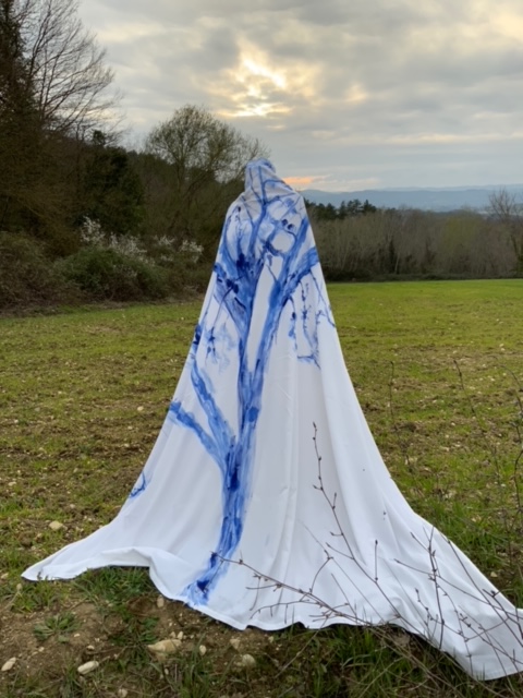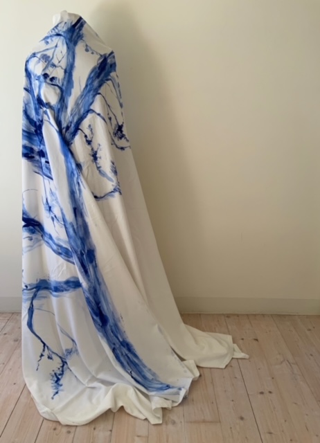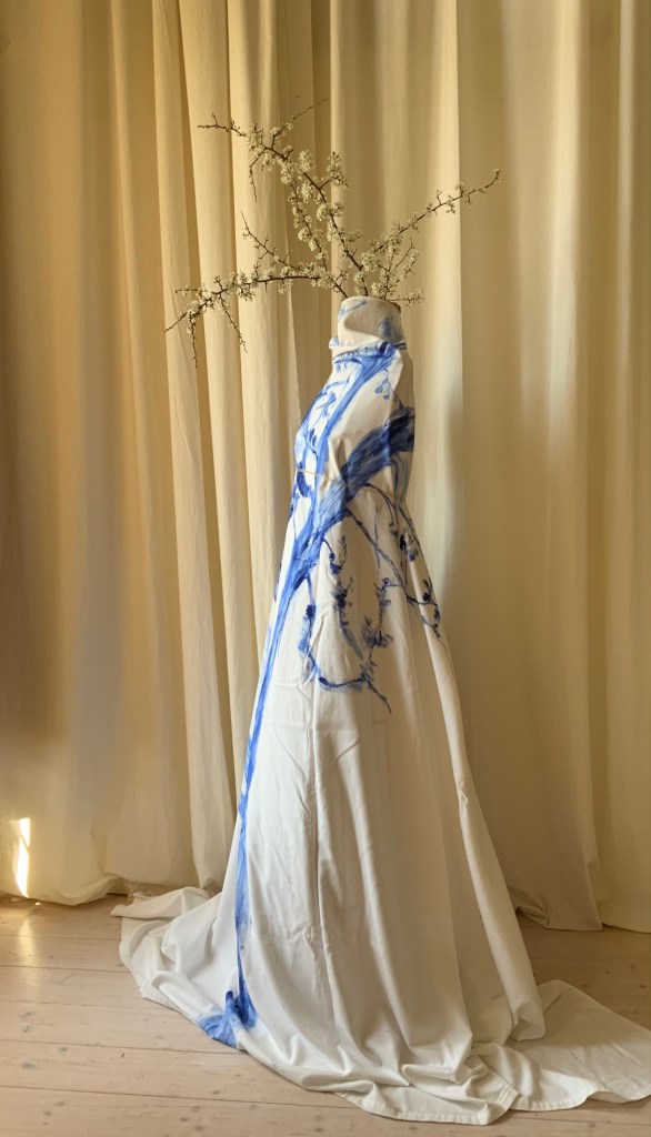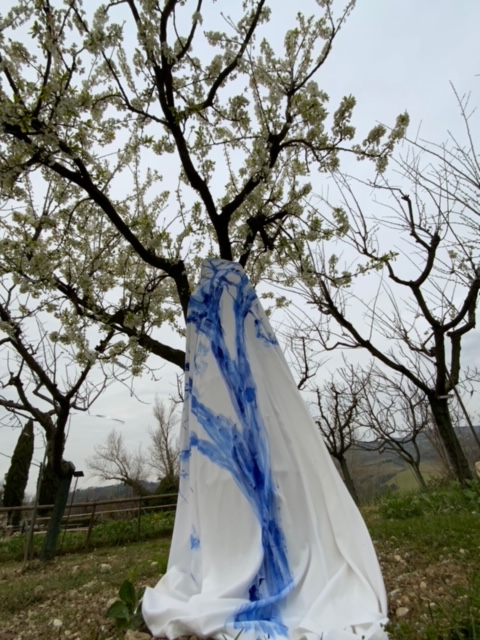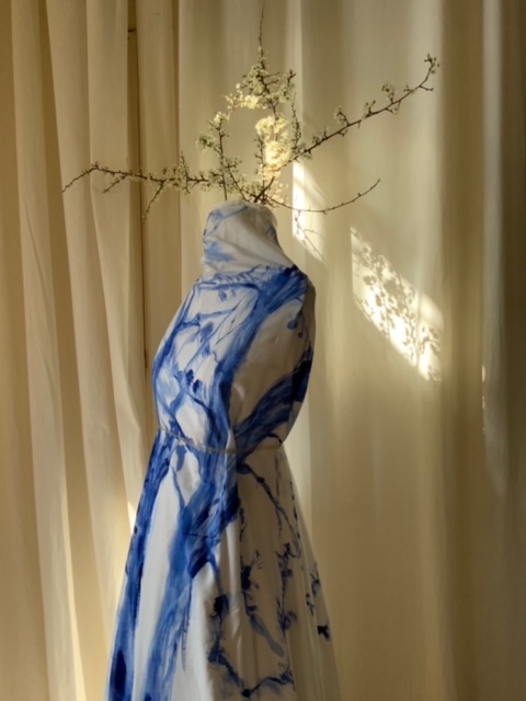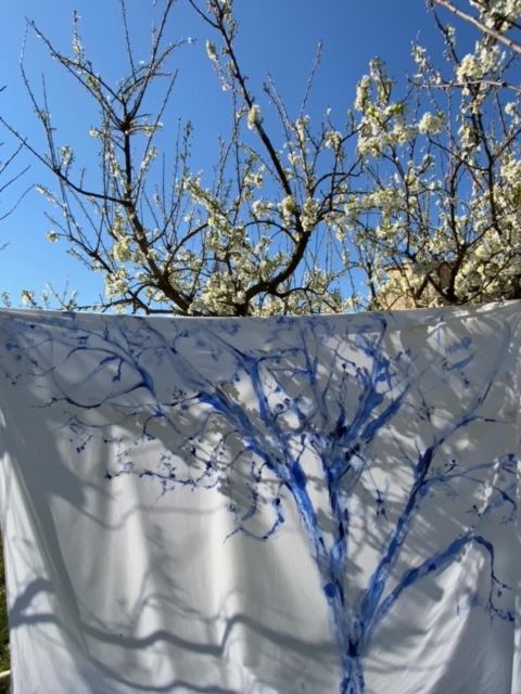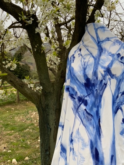 עצי השזיף בבוסתן שלנו הם ה“דוגמנים”. אילנה פרשה יריעות כותנה לבנה ובתנועות יד מהירות של המכחול הטבול בצבע כחול קובלט עמוק לכדה את צללית העץ הפורח על גבי הבד. הפעם הרעיון לאוסף בגדים חדש, כמו שמלת כותנה ארוכה, חצאית או אולי כותונת בעיצוב אילנה אפרתי נותר בגדר רעיון. זו סקיצה תאורטית שלא תהפוך לבגדים. ההחלטה הזו היא מחווה של ויתור ותזכורת לשנה החולפת בה העולם עצר. זה גם צילצול אזהרה לנזקים שתעשיית הבגדים המהירה ותאוות הצרכנות מביאים על העולם.