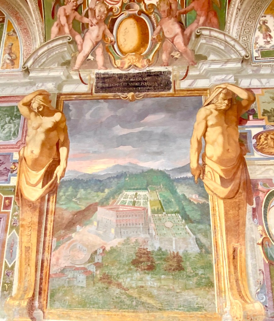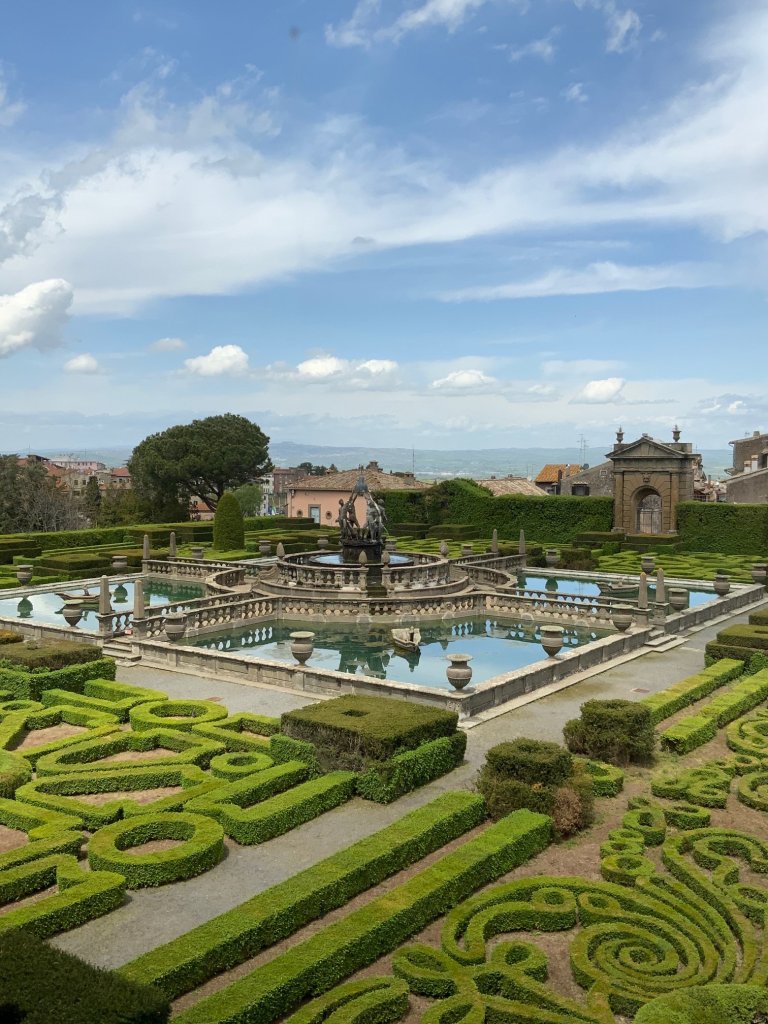 גנים שיופיים זהה כל השנה בהעדר פרחים או צמחים עונתיים. הגן וזוג הוילות הסמטריות נבנו בתקופות שונות, ועל התכנון ניצח הארכיטקט האיטלקי הידוע Vignola. מבנה הקרקע המשופע והבדלי הגבהים נוצלו בצורה מושלמת על ידי מהנדס מים מפורסם מסיינה שבנה מערכת מים שזורמים בכוח הכבידה מהמפלסים העליונים ועד הבריכה המרכזית בעיצוב Gimbologna (אמן פלמי שעבד ויצר בעיקר בפירנצה ברנסנס המאוחר) השוכנת במפלס התחתון ונשקפת מחלונות הוילה.