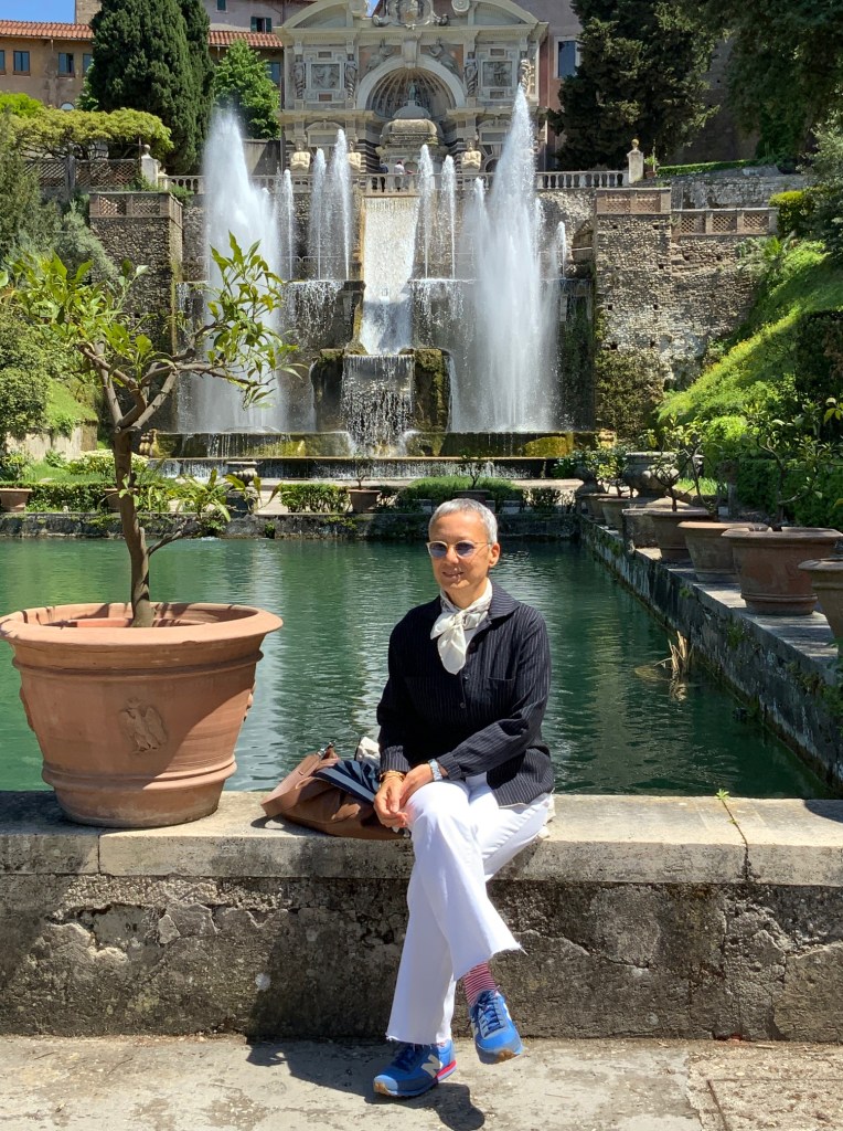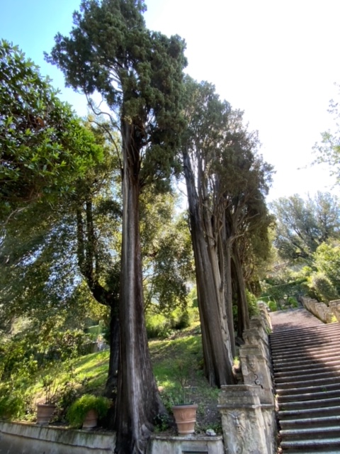 גרם מדרגות הוביל אותנו מהוילה אל עבר המרפסת הרחבה המשקיפה על הגנים התלולים הנפרשים תחתיה ואל עבר הבתים העתיקים של טיבולי הרחק באופק. צלילי המים הניתזים מהמזרקות, פיכפוך הבריכות נישאים באויר ואיוושת העלים של העצים העתיקים שקומתם נישאת לשמיים, כולם מזמינים לרדת בגרם המדרגות התלול אל הגן.