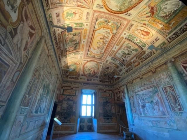 דרך חצר פנימית מרוצפת ושופעת אור מתחיל מסע בחדרים ואולמות מצוירים על ידי מיטב ציירי רומא של הרנסנס המאוחר, הידוע כסגנון המנייריסטי כמו ג׳ירולמו זוקרי girolamo zuccari ועוזריו ורבים אחרים, אמנים ואומנים, פסלים, מהנדסים ומומחים שהועסקו על ידי הקרדינל כדי לממש פנטזיות ולהגשים את החלומות של איש הרנסנס, בנם של לוקרציה בורג׳ה ואלפונסו דאסטה דוכס פרארה (שגם הוא נודע כפטרון האמנות).
