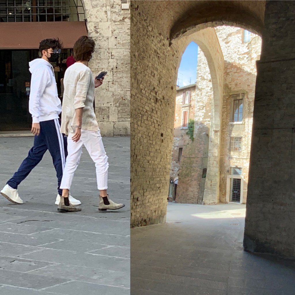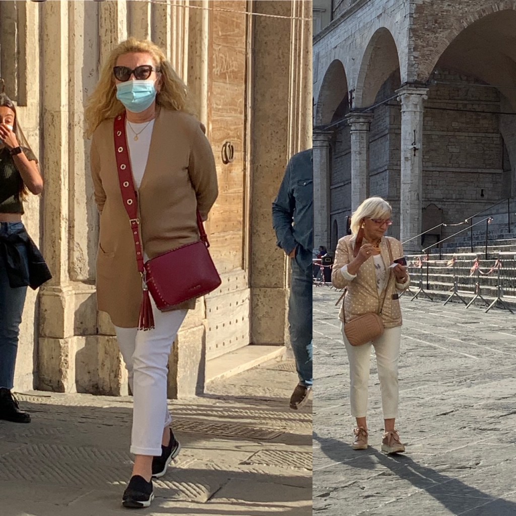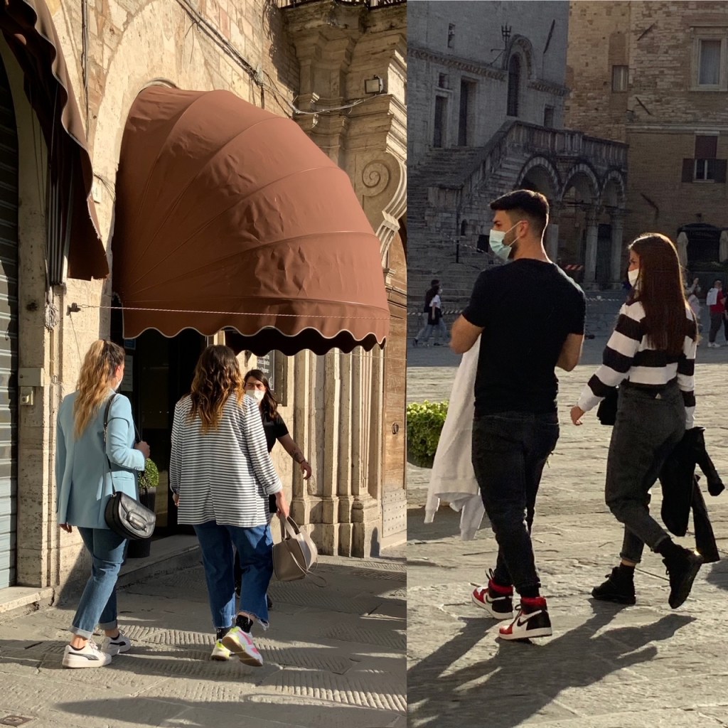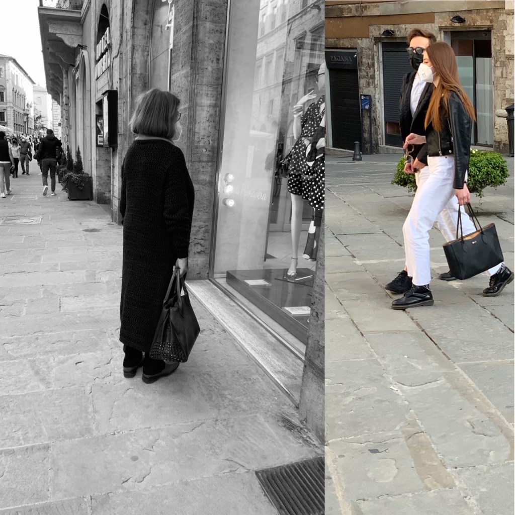 גם אנו שבנו לשוטט, לצלם ולשתף אתכן ברשמינו מהשינויים במרחב העירוני איטלקי פוסט לוקדאון. קשה לומר שהמקומיים זרקו על עצמם משהו ויצאו מהבית באופן מרושל. אולי אפילו ניתן לומר שהחזרה אל הרחוב מלווה בהקפדה על פרטים. התרשמנו מטרנד הסניקרס הנוכחי שמקבל כאן פרשנויות אישיות. הבחירה איננה נופלת בהכרח לבנאליות של מותגים נפוצים, הנעליים הספורטיביות מסוגננות למדי ומוסיפות קלילות לבגדים מחויטים מאריגים. זה חיבור מומלץ שיוצר עניין בניגוד למשל לחיבור בנאלי של נעל ספורט עם טייץ או טרנינג.