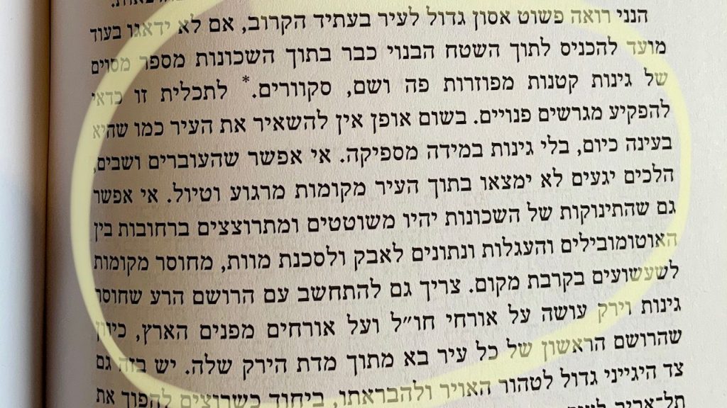 השיבה לתל אביב אחרי למעלה משנה וחצי היא כמו שיבה לעיר אחרת. נתיבי תנועה נסגרו ללא פתרון תחבורתי חילופי הולם לתושבים ולמבקרים. חפירות בכל רחוב, מגדלים חדשים נושקים לעננים, כל בנין הוא אתר בנייה. המסחר הקמעונאי, החנויות הקטנות, בעלי המקצוע הזעירים, המארג שמניע את התרבות האורבנית נראה כמשותק. אם פעם חשבנו שהעיר סובלת מפקקי תנועה ומבעיית חניה בהעדר תחבורה ציבורית הולמת ויש לשפר את המצב, עכשיו המצב הפך הרבה יותר גרוע. גם אפקט הרעש התעצם באופן משמעותי כי בנוסף לשאון העיר הקודם התווספו עכשיו רעשי משאיות הבטון, אקדחי האויר שחופרים באדמה, טרקטורים ודפיקות פטישי הבנאים.