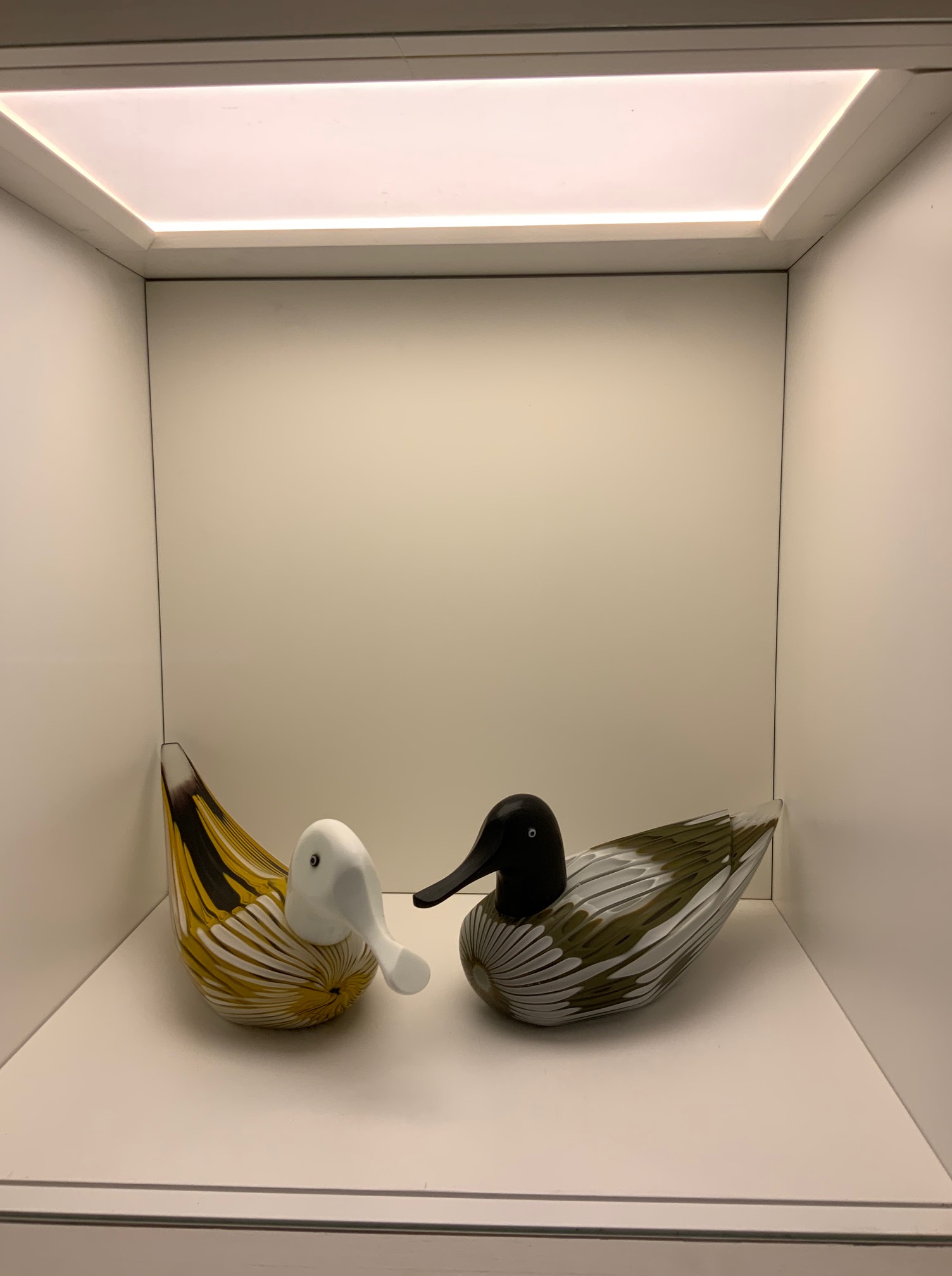מאידך העבודות של טוני זוקרי האיטלקי מתאפיינות בצבעוניות עזה ודקורטיביות, כמו קיר הזכוכית שתכנן עבור בנק בפדובה, או אוסף הציפורים והברווזים היפיפה המוצגים בקופסאות מוארות. יחד הם מרחיבים את גבולות השפה האסתטית הייחודית ליצירות הזכוכית, בין שקוף לאטום, בין אקווארליות מעודנת לחומריות וצבעוניות אטומה וכבדה. הזכוכית היא חומר עתיק ומרתק שהאדם הפליא ליצור בו יופי שברירי עם נוכחות חזקה ונצחית.