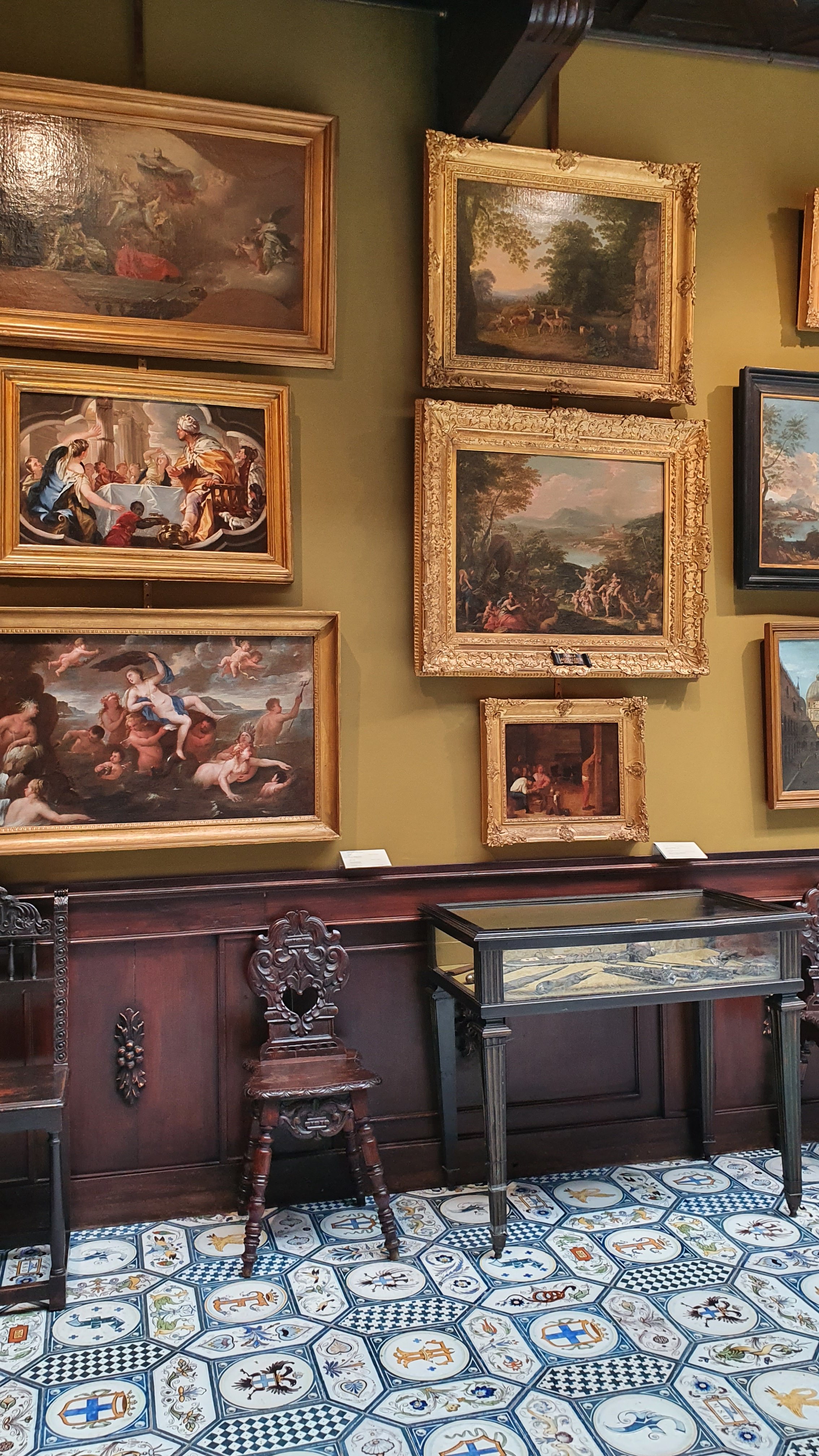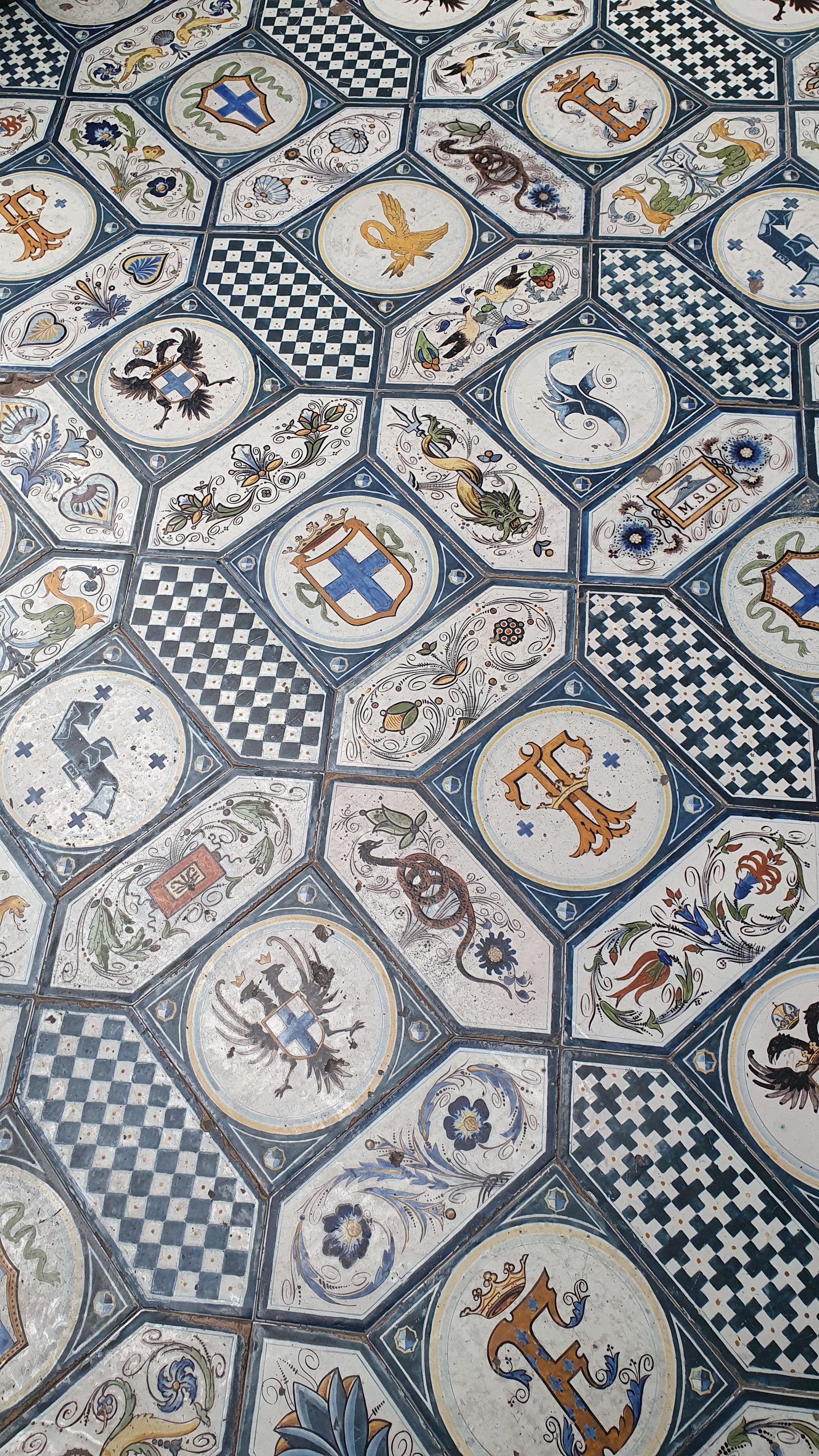 בעינינו, רצפת הקרמיקה המצוירת ביד, עשויה אריחים בהירים המעוטרים בסמלי המשפחה, היא היצירה הייחודית ביותר בחדר, שעמוס ביצירות יפות ונדירות.