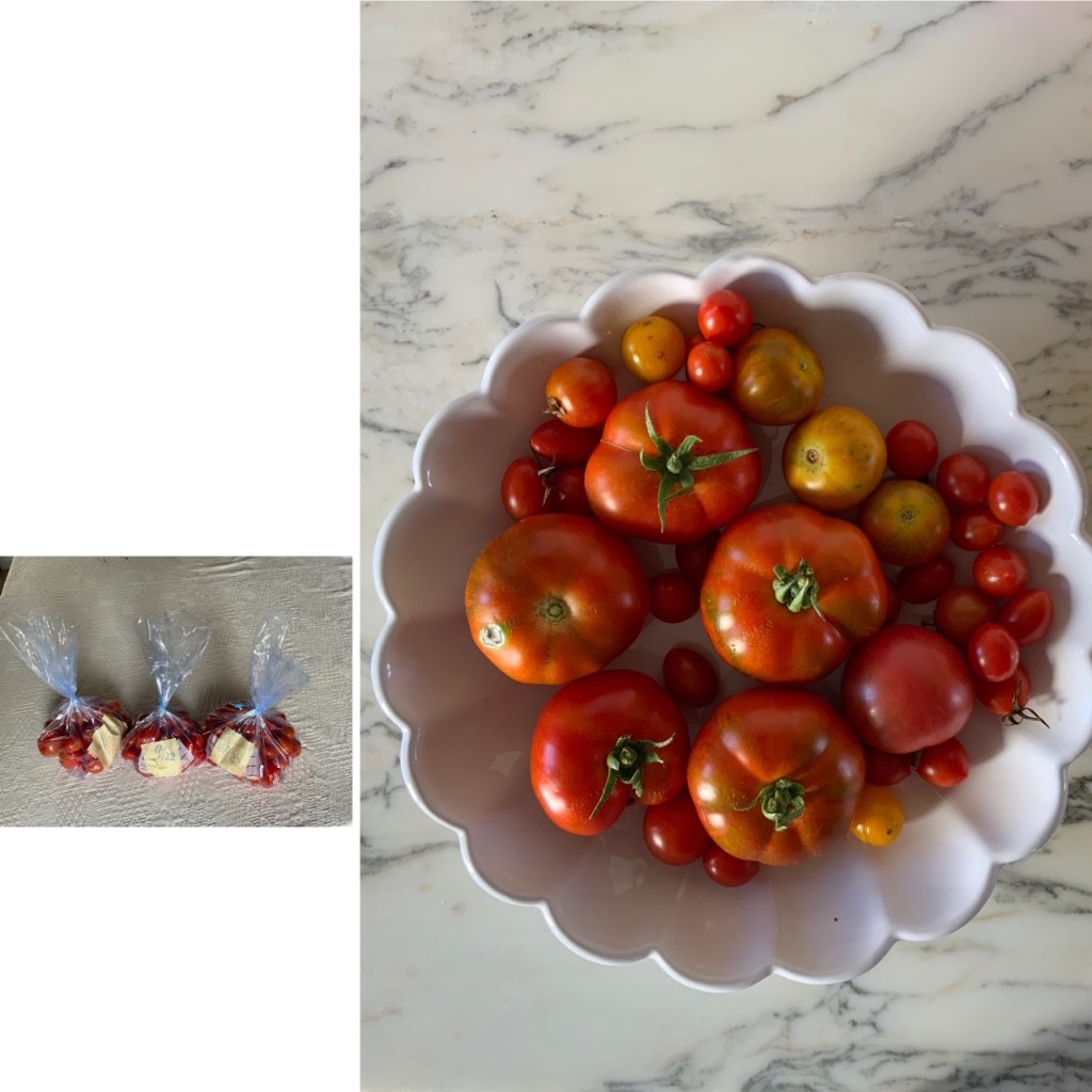 עגבניות טריות אנחנו אוספות בשקית ומקפיאות וכך יכולות בחורף לזרוק לסיר ולבשל כל תבשיל שדורש עגבניות.