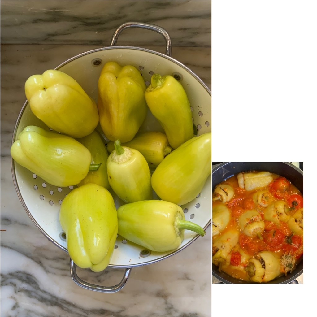פלפלים ועגבניות ממולאים באורז, בשר כבש ושום.
