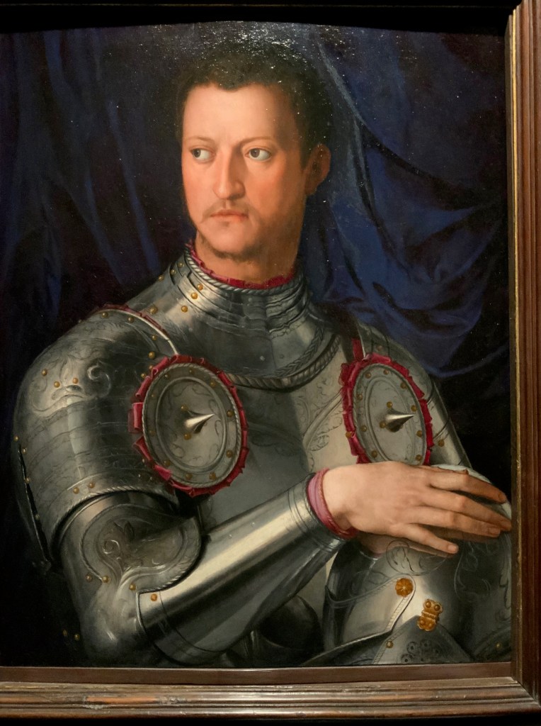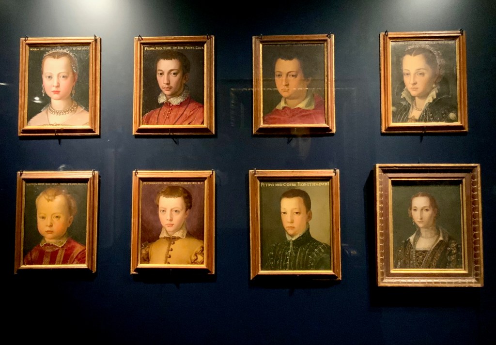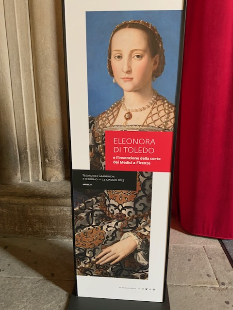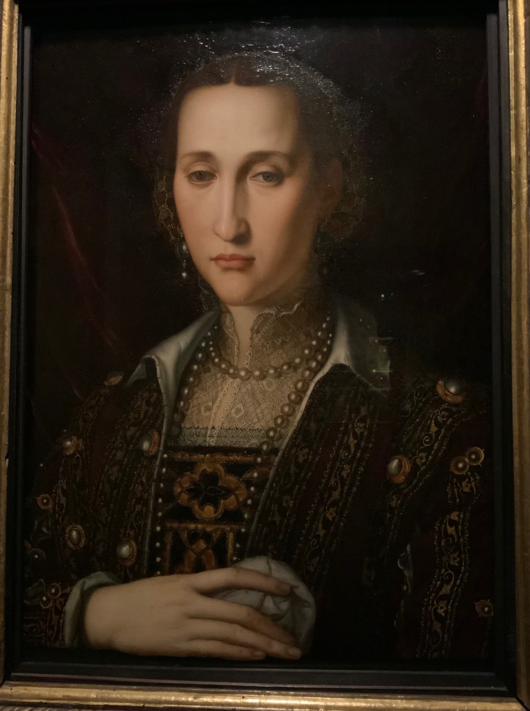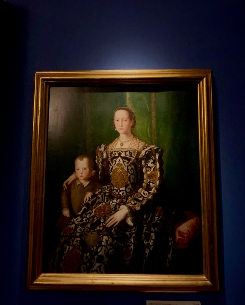 בקומת הקרקע של הארמון פסענו דרך מסך קטיפה אדום-רוביה מלכותי שהוביל אותנו אל אולמות עטורי ציורי פרסקו מרשימים בהם שמורים אוצרות המדיצ׳י. אלאונורה היתה אולי הדמות הכי מפורסמת של הצייר ברנזינו, שהציג אותה כאישה מעודנת בפורטרטים הנפלאים שצייר. אך היא לא הייתה דמות פסיבית או קישוט בחצר הדוכס קוזימו הראשון: אלאונורה הייתה שותפה, אשת סוד, מעורבת בפוליטיקה וברזי הממלכה. היא הייתה אשת עסקים אמידה שיזמה וטיפחה את הנראות של חצר המדיצ׳י ומימנה פרויקטים של בעלה הדוכס. היא הביאה איתה לפירנצה טעם משובח שמקורו במוצאה הספרדי ובשנים שחיה בארמון של אביה שליט נאפולי Pedro Alvares de toledo . בנוסף לאסתטיקה משובחת ולחוש אופנתי, היא הייתה בעלת הון רב משלה, באמצעותו רכשה את האדמה סביב ארמון הפיטי והפכה אותה לגן מרהיב (כתבנו עליו כאן).