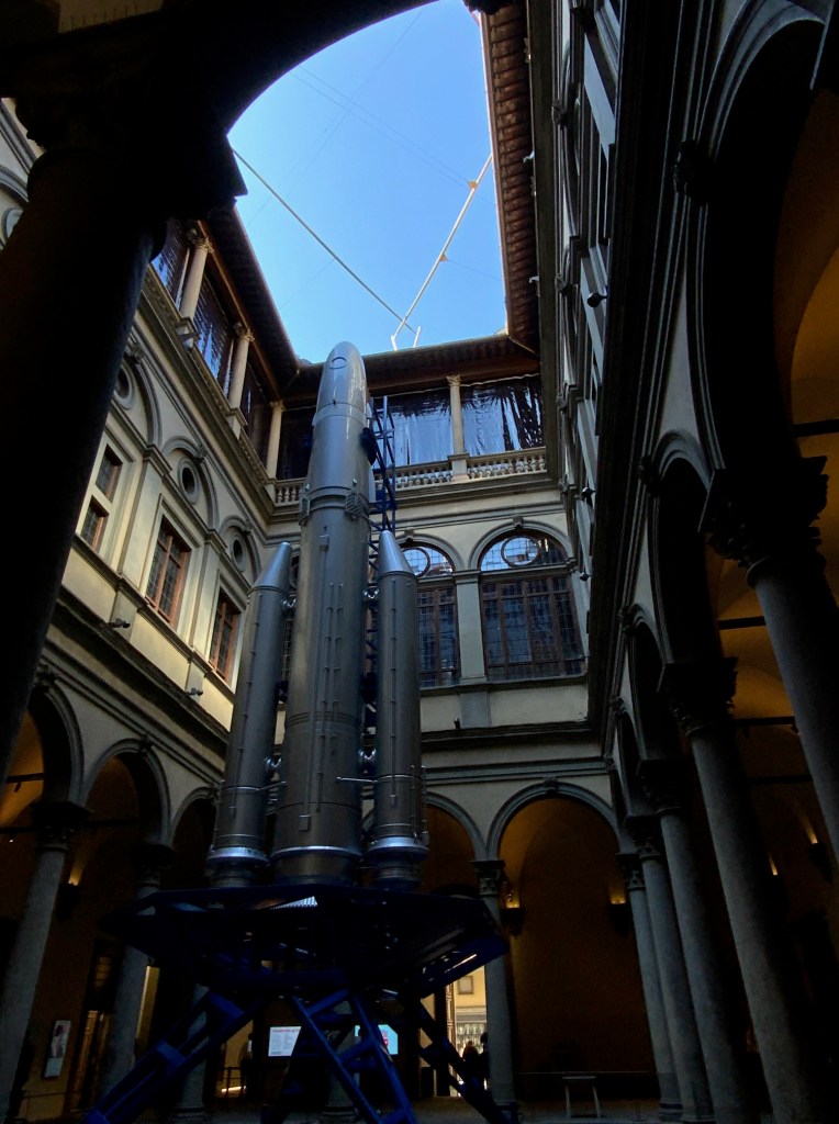 את פני המבקרים מקבלת עבודה עם נוכחות חזקה של אמנית פולניה, Goshka Macuga, שיצרה טיל עם כן שיגור בגוון כחול בוהק המופנה לשמים, ״לכוד״ במרכז החצר הפנימית של הפאלאצו העתיק.