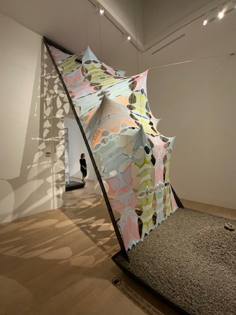 הביתן האנגלי כלל מייצב טקסטיל בעל מבנה אורגני, שהנושא שלו הוא הקשר בין מהגרים בדיאספורה למדינות המקור שלהם. טקסטיל סרוג מתוח על מסגרת עץ יוצר מין מבנה דמוי אוהל ארוג מחוטי כותנה אורגנית וסיבי אננס בפאלטה של צבעים טבעיים, ומהווה מחשבה מופשטת על האופן שבו בתים יכולים להתאים לזהויות מהגרים מורכבות בעולם.