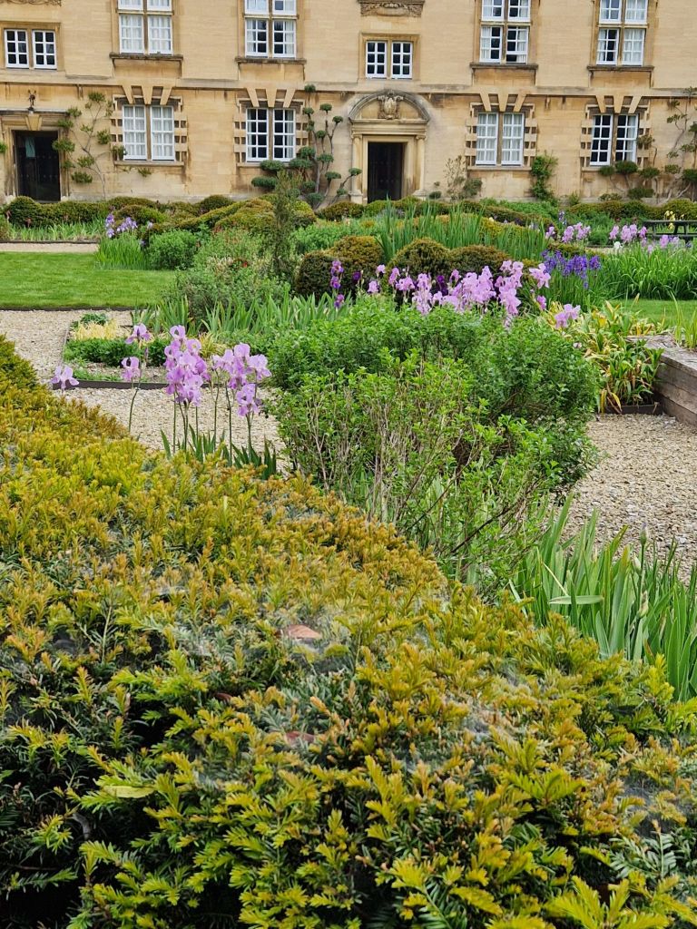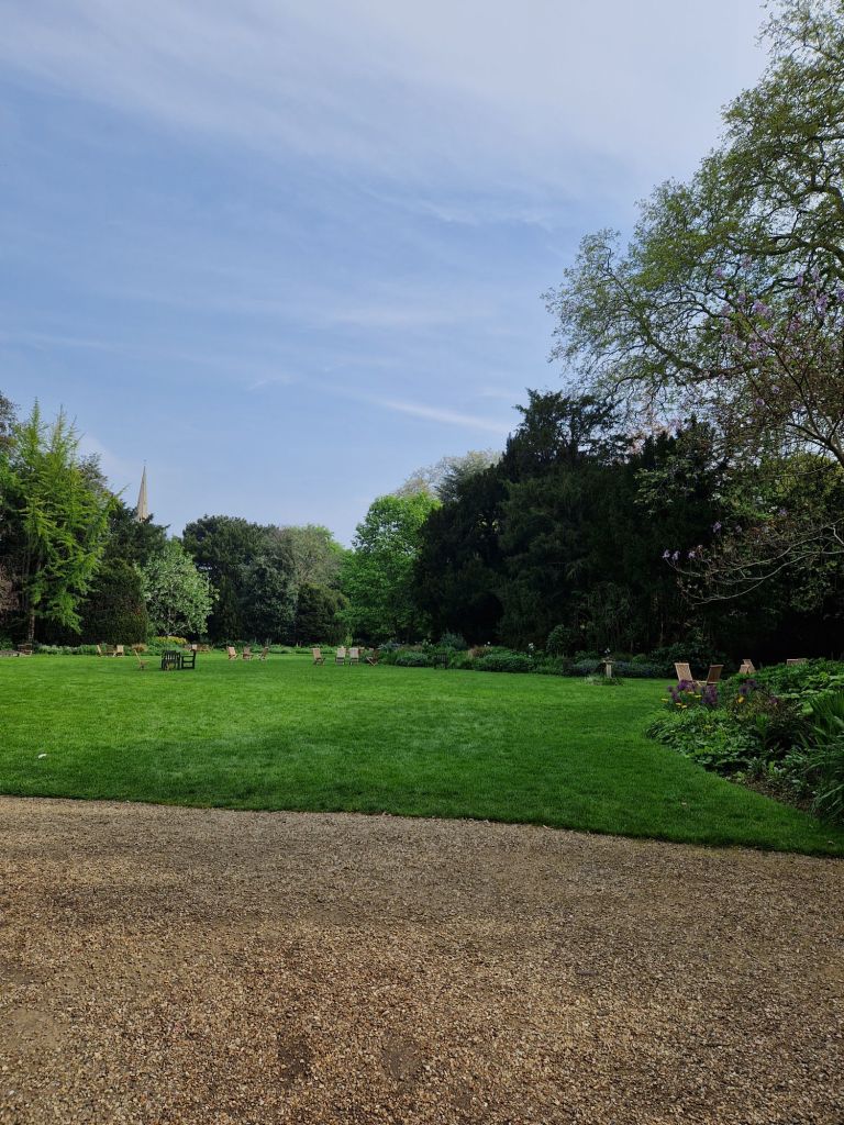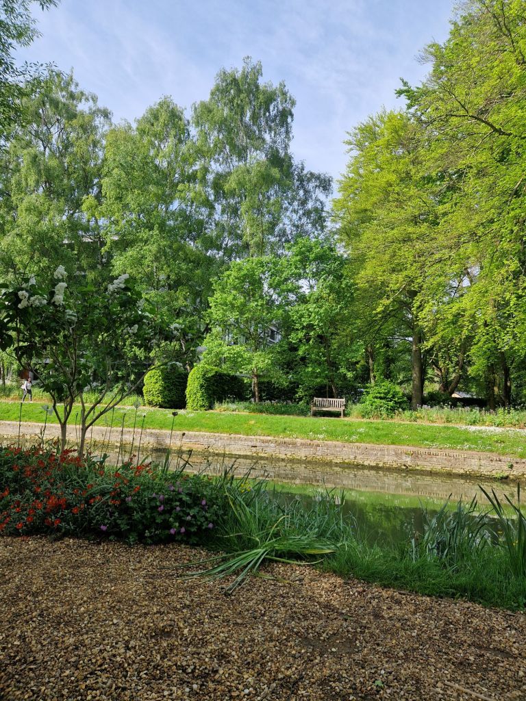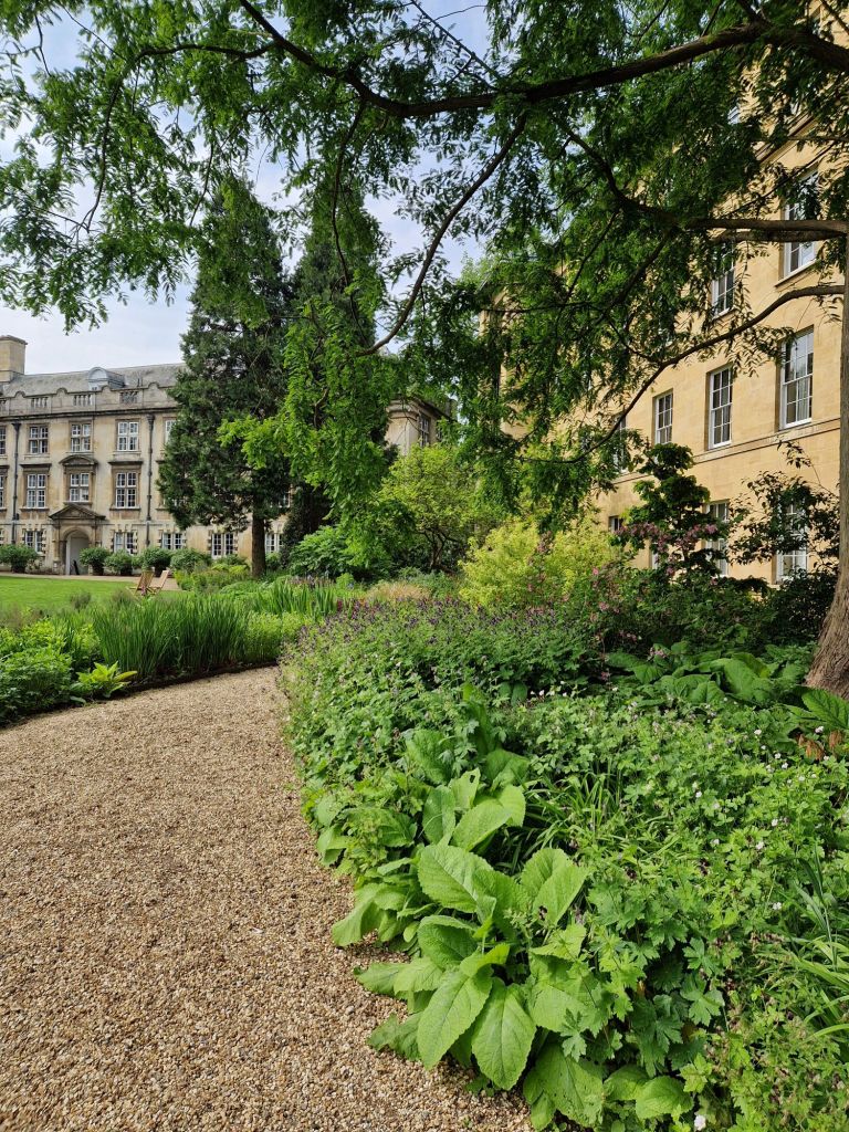 הגנים של אוניברסיטת קימברידג' מתחלקים למעשה בין הקולג'ים השונים. בקרייסט קולג' שבמרכז העיר הגנים מטופחים בדקדוק, והאירוסים הפורחים ממלאים אותם בכחול. בקווינס קולג' שלאורך הנהר הסטודנטים יושבים בספסלים אחר הצהרים, או מסתובבים בין השבילים בבגדי ערב אחרי השקיעה. הגן הוא מפלט מהעיר והספרייה, אבל גם מקום בו אפשר להחליף רעיונות, למצוא השראה.