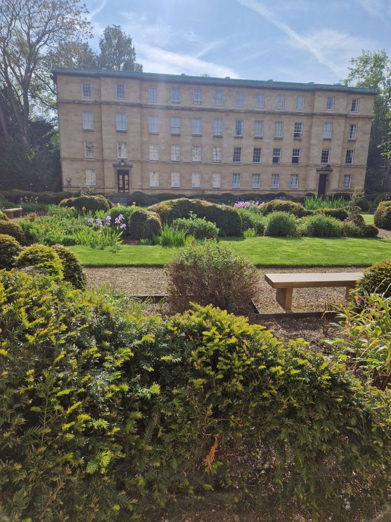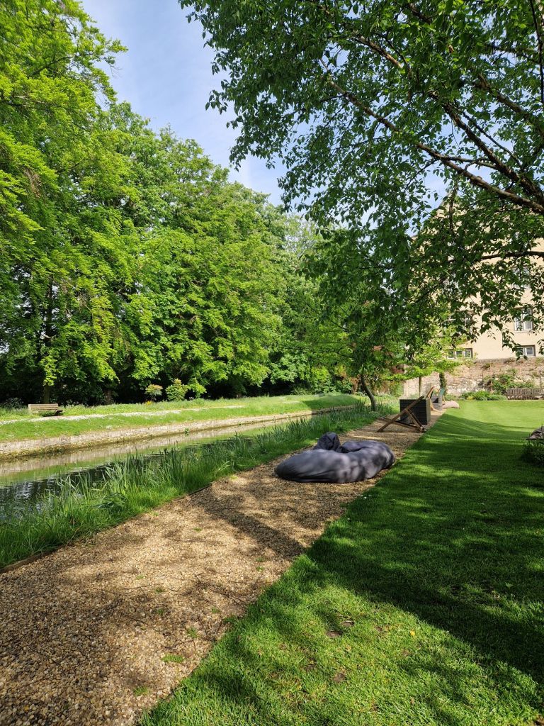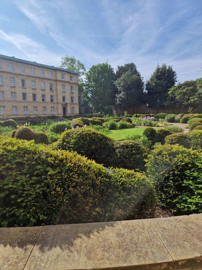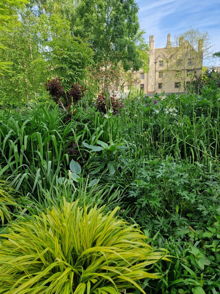 הגנים של אוניברסיטת קימברידג' מתחלקים למעשה בין הקולג'ים השונים. בקרייסט קולג' שבמרכז העיר הגנים מטופחים בדקדוק, והאירוסים הפורחים ממלאים אותם בכחול. בקווינס קולג' שלאורך הנהר הסטודנטים יושבים בספסלים אחר הצהרים, או מסתובבים בין השבילים בבגדי ערב אחרי השקיעה. הגן הוא מפלט מהעיר והספרייה, אבל גם מקום בו אפשר להחליף רעיונות, למצוא השראה.