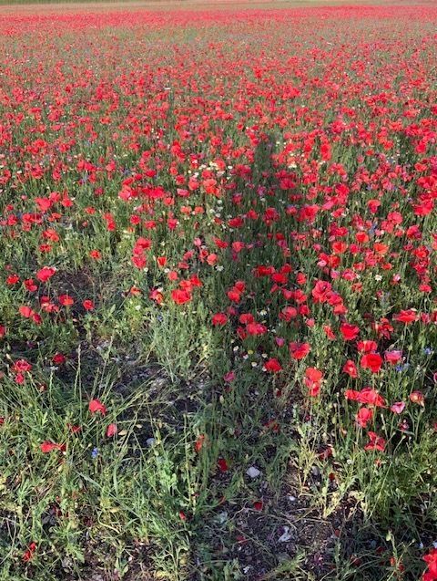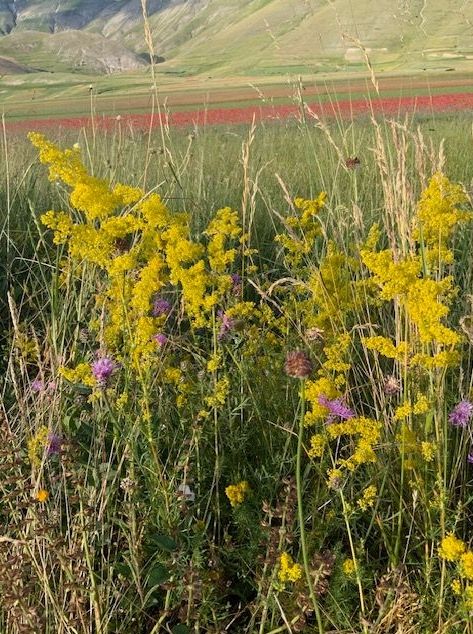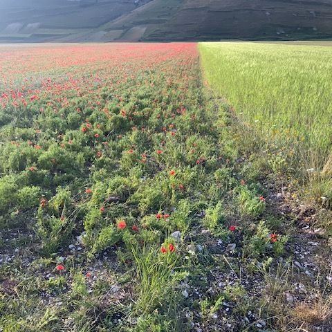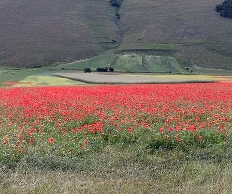 השבוע כשהטמפרטורות עלו וחום הקיץ החל להעיק יצאנו אל ההרים לחזות בפריחת הפרגים. פריחה מאוחרת זו מאפיינת איזורים גבוהים בהם הטמפרטורה עדיין מתחת לעשרים מעלות והאדמה רוויה במי שלגים מאוחרים. בעוד שבאיזורים המישוריים הטמפרטורה כבר נסקה לשלושים וחמש או ארבעים מעלות ,וברומא העיר נמדדה טמפרטורה של חמישים מעלות באיזורים מסויימים כמו הקולסאום, כאן בהרים בגובה 1400 מטר מעל פני הים, עדיין ניתן להנות מקרירות כמעט חורפית. המבט חובק את השדות וההרים מהם ניבטים אין סוף גוונים של ירוק מנוקדים בפרחים אדומים כחולים ולבנים. למרגלות ההרים נפתחים מישורים רחבי ידיים כמו שטיחי ענק צבועים באדום לוהט, שדות רחבים של פרחי פרג רעננים וטריים.