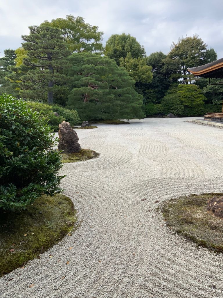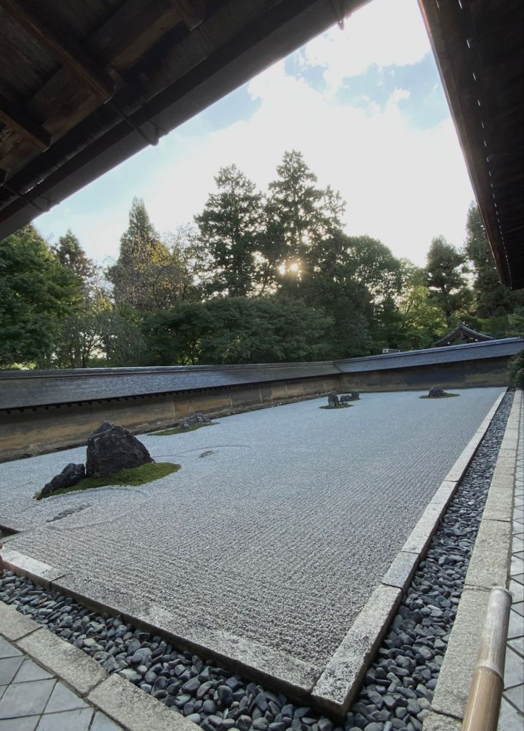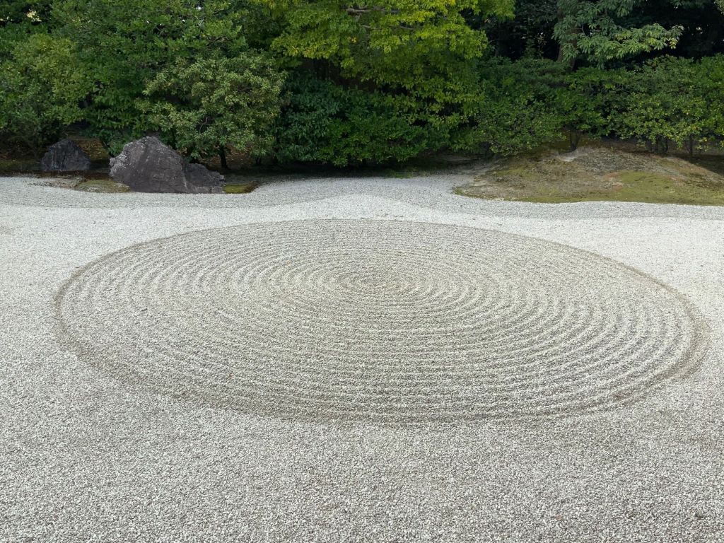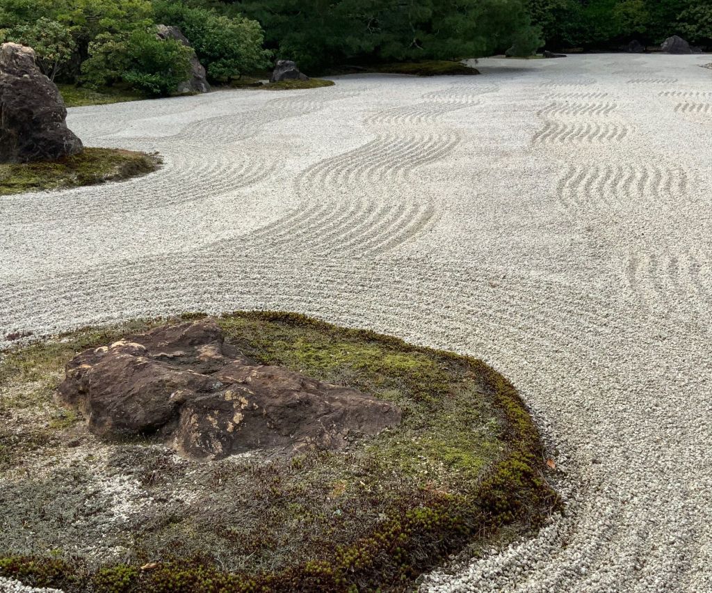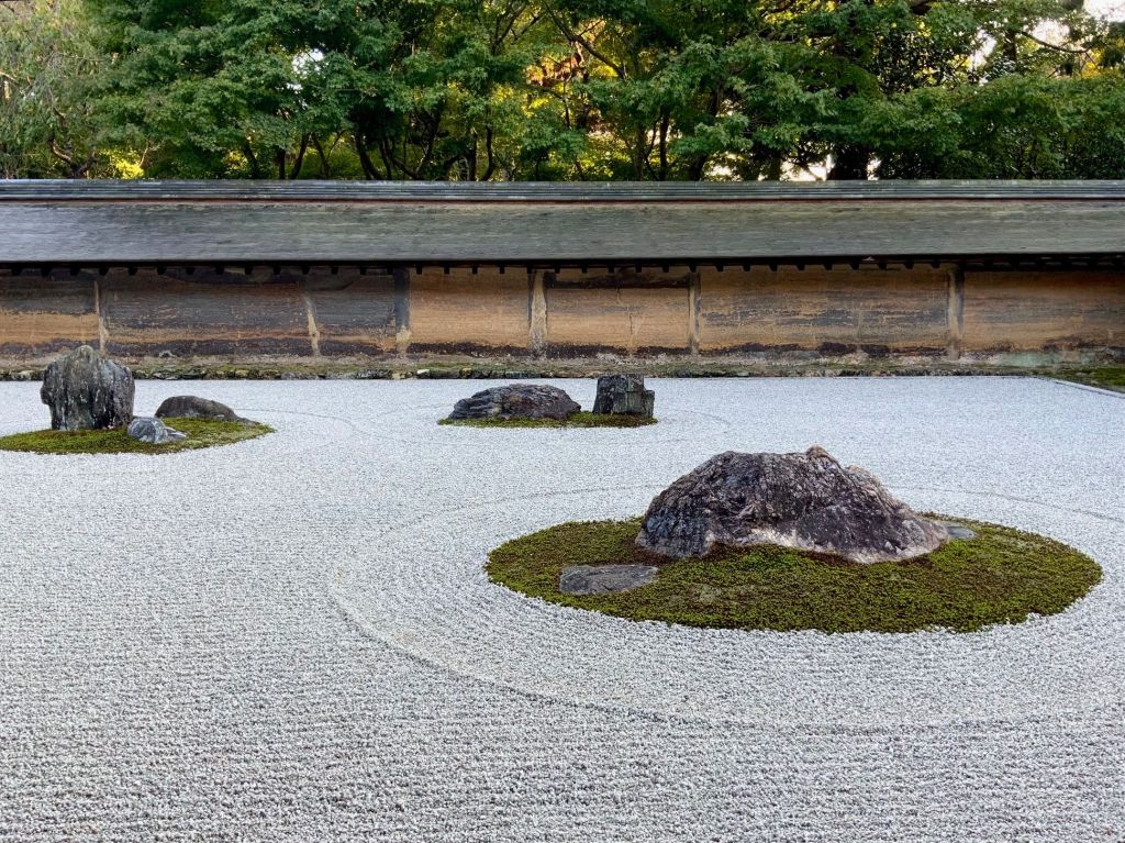 אחד הגנים ששבנו וביקרנו בו הפעם מפורסם במיוחד כ-׳גן יבש׳ ביפנית karesansui. חמשה עשר סלעים כהים מנוקדים באזוב ירוק מונחים במין חצר מוקפת חומה ומסביבם חצץ בהיר מגורף בקפדנות נזירית המדמה מעין אגם מים, זה הוא מקדש Ryōan-ji בקיוטו. כמובן שדברים השתנו והיום ריבויי התיירים הגודשים את המקדשים מייצר ליפנים אתגר משמעותי כיצד ניתן להנות מכלכלת התיירות ועדיין לשמור על השקט והריקנות שהם לב המקום הזה שמזמין את המבקר לקחת חלק ולשבת דומם ורגוע ברגע של צפייה מדיטטיבית ושלווה ביופי הניצב מולו.