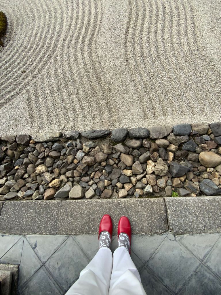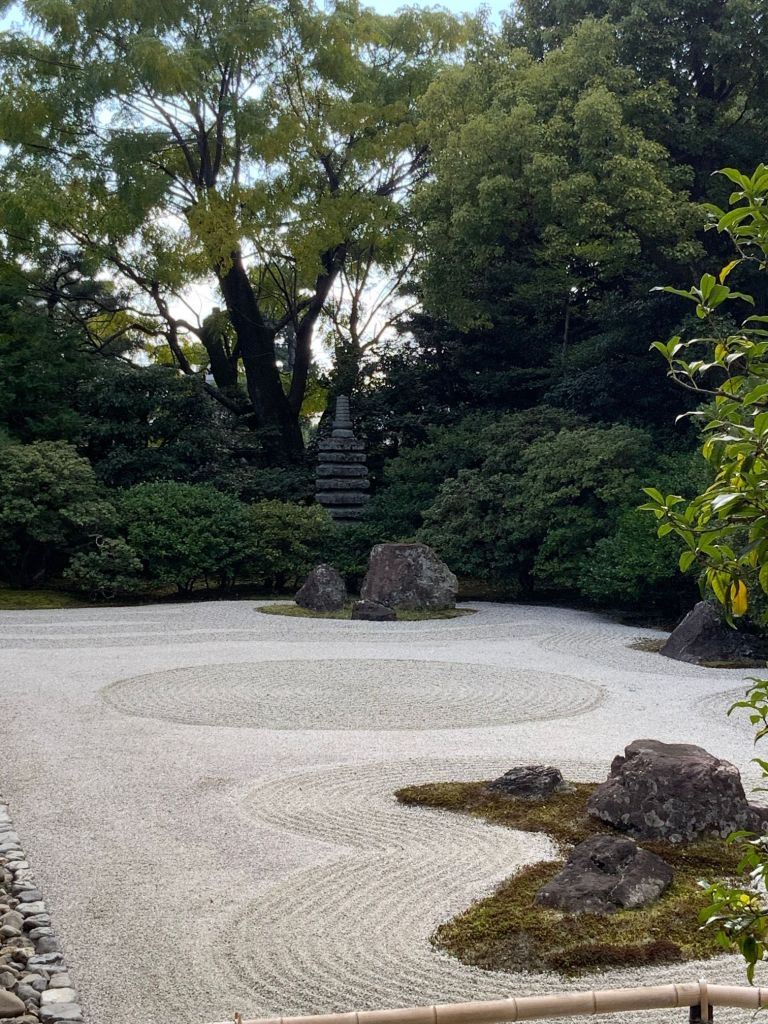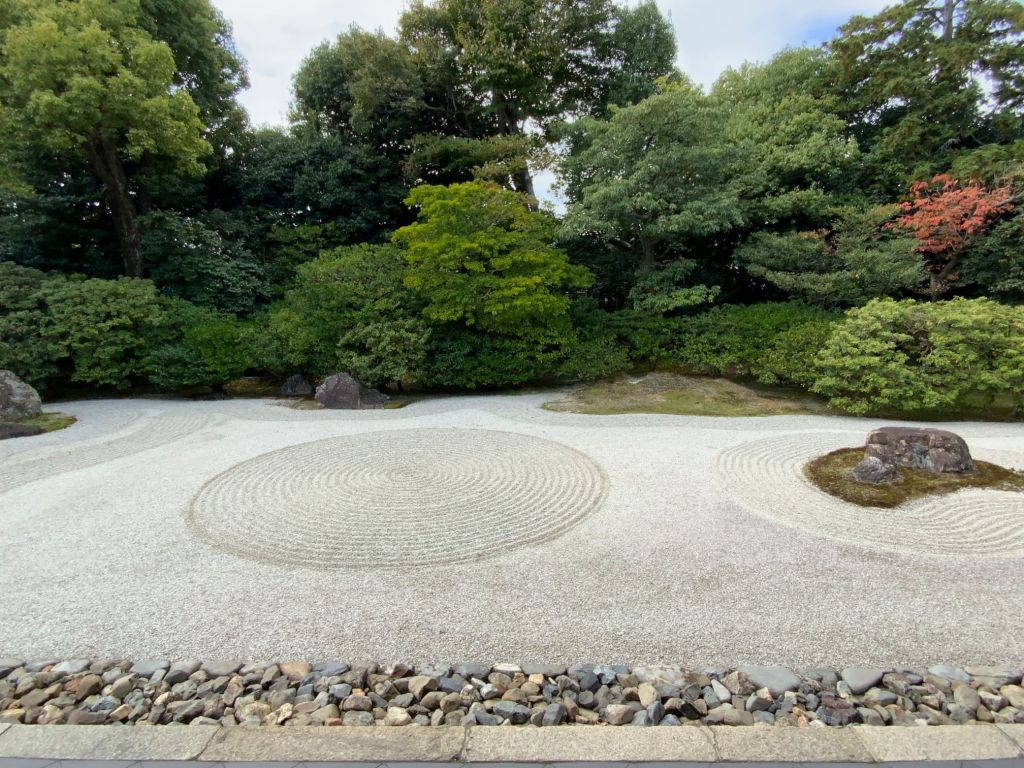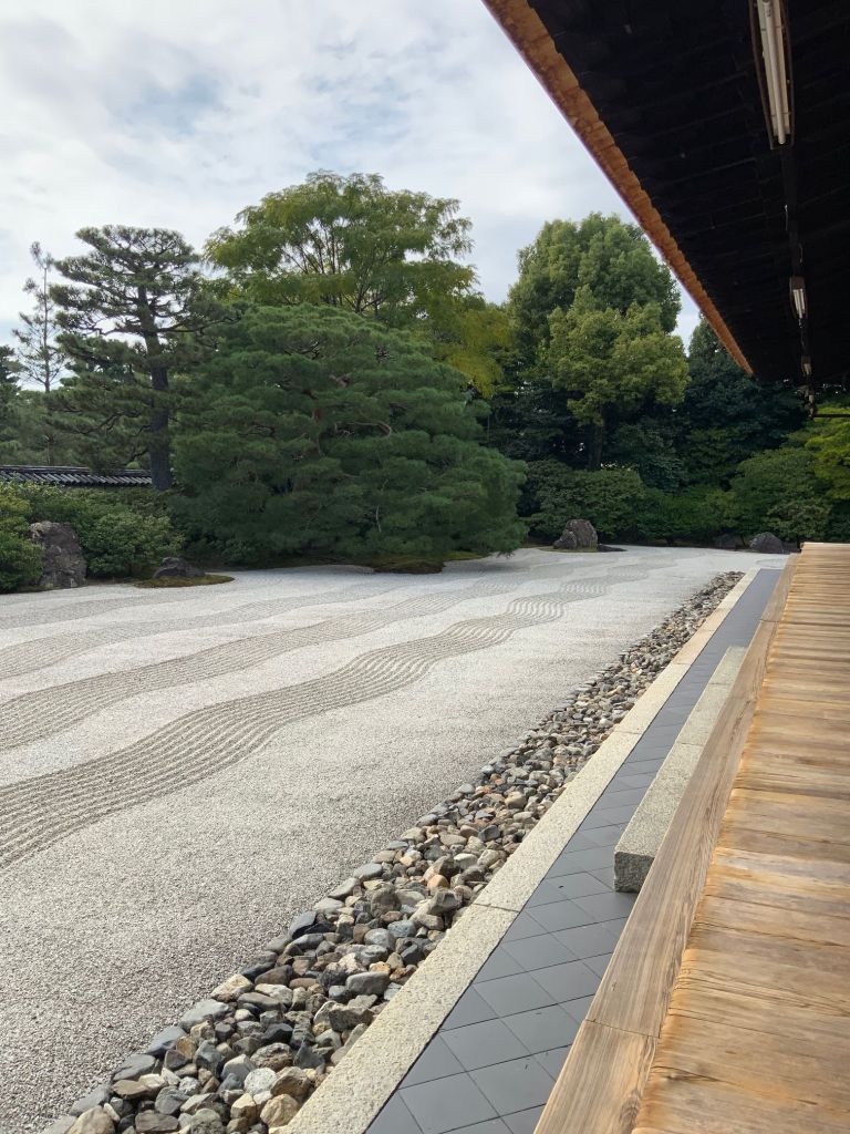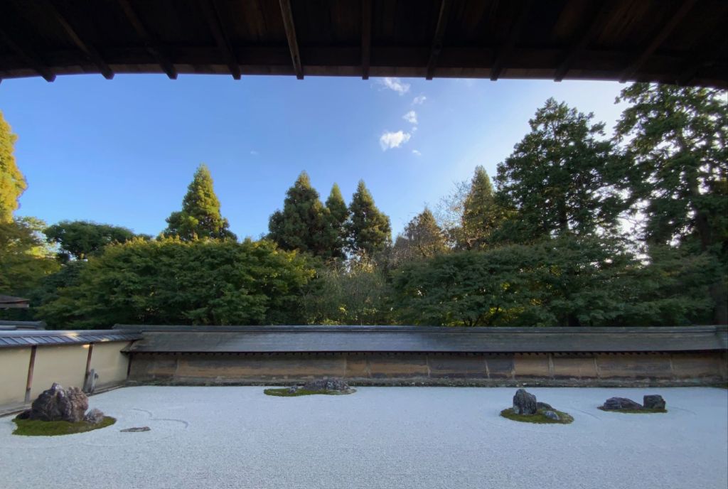אחד הגנים ששבנו וביקרנו בו הפעם מפורסם במיוחד כ-׳גן יבש׳ ביפנית karesansui. חמשה עשר סלעים כהים מנוקדים באזוב ירוק מונחים במין חצר מוקפת חומה ומסביבם חצץ בהיר מגורף בקפדנות נזירית המדמה מעין אגם מים, זה הוא מקדש Ryōan-ji בקיוטו. כמובן שדברים השתנו והיום ריבויי התיירים הגודשים את המקדשים מייצר ליפנים אתגר משמעותי כיצד ניתן להנות מכלכלת התיירות ועדיין לשמור על השקט והריקנות שהם לב המקום הזה שמזמין את המבקר לקחת חלק ולשבת דומם ורגוע ברגע של צפייה מדיטטיבית ושלווה ביופי הניצב מולו.