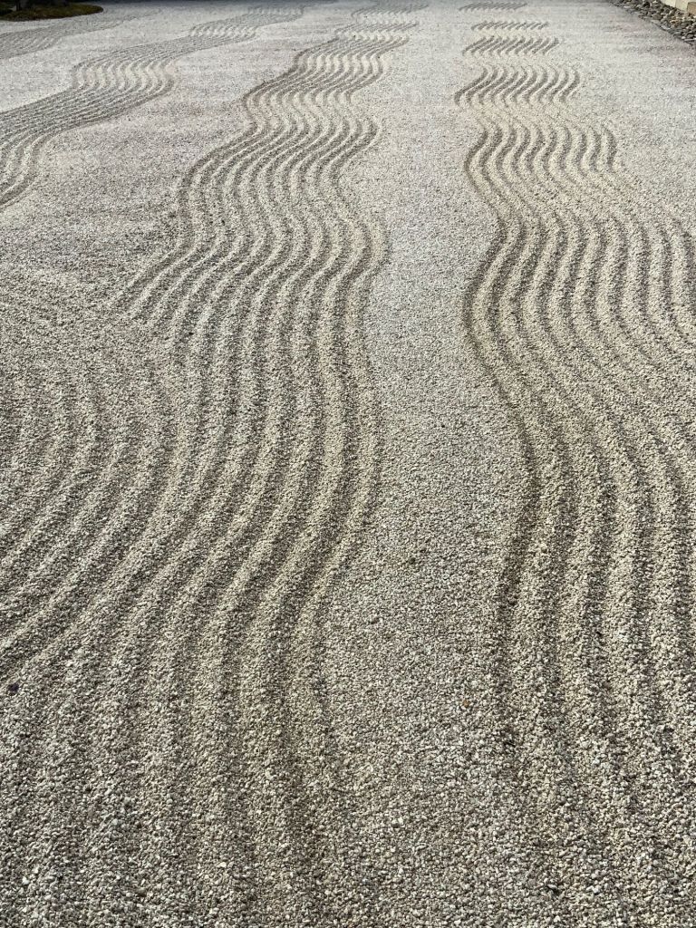 פעולת הגירוף היומית באמצעות מגרפת עץ יחודית מנקה את החצץ מעלי השלכת ויוצרת אשלייה של גלים כמו אלו שנוצרים לרגע כשאבן מושלכת למים.