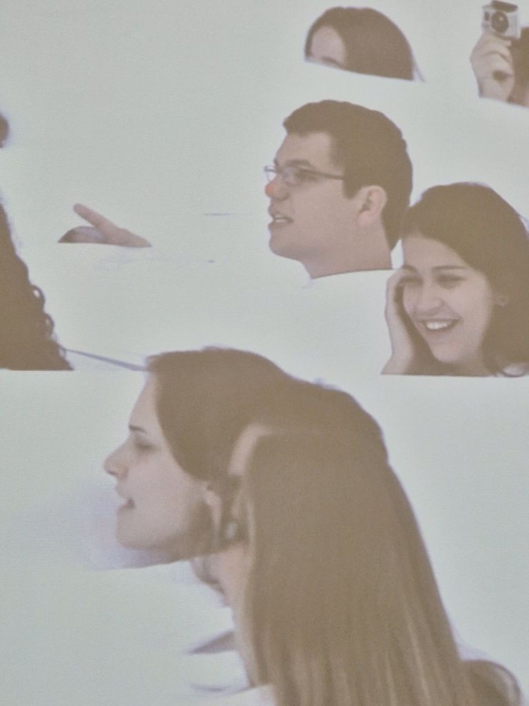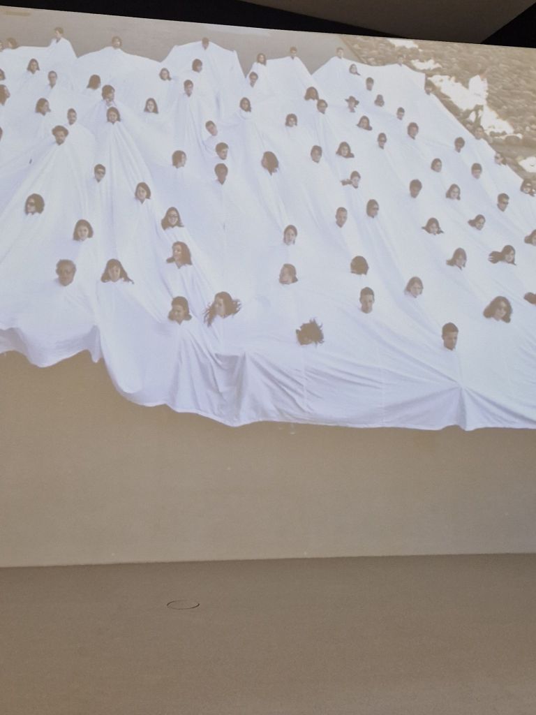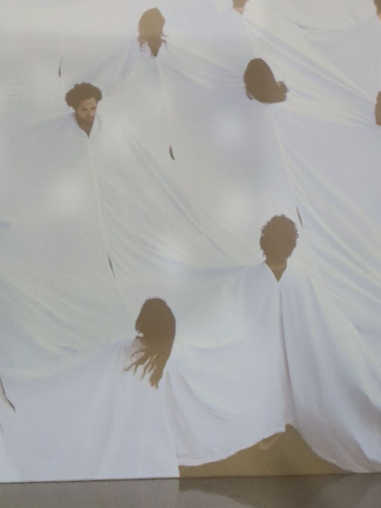 האחד, הוא מיצב וידאו שהיא צילמה בברזיל, בו קבוצת אנשים זרים שרבבו ראשם דרך חורים בסדין לבן גדול וכך צעדו יחד בכביש, לכאורה נפרדים אבל למעשה מחוברים בבד. בווידאו רואים איך נוצרת ביניהם אינטראקציה ידידותית אחרי המבוכה הראשונית, ויש במפגש הבסיסי הזה, שקורה דרך הבד, אווירה אופטימית ופשוטה.