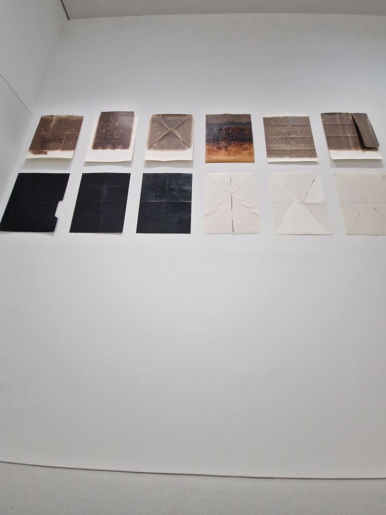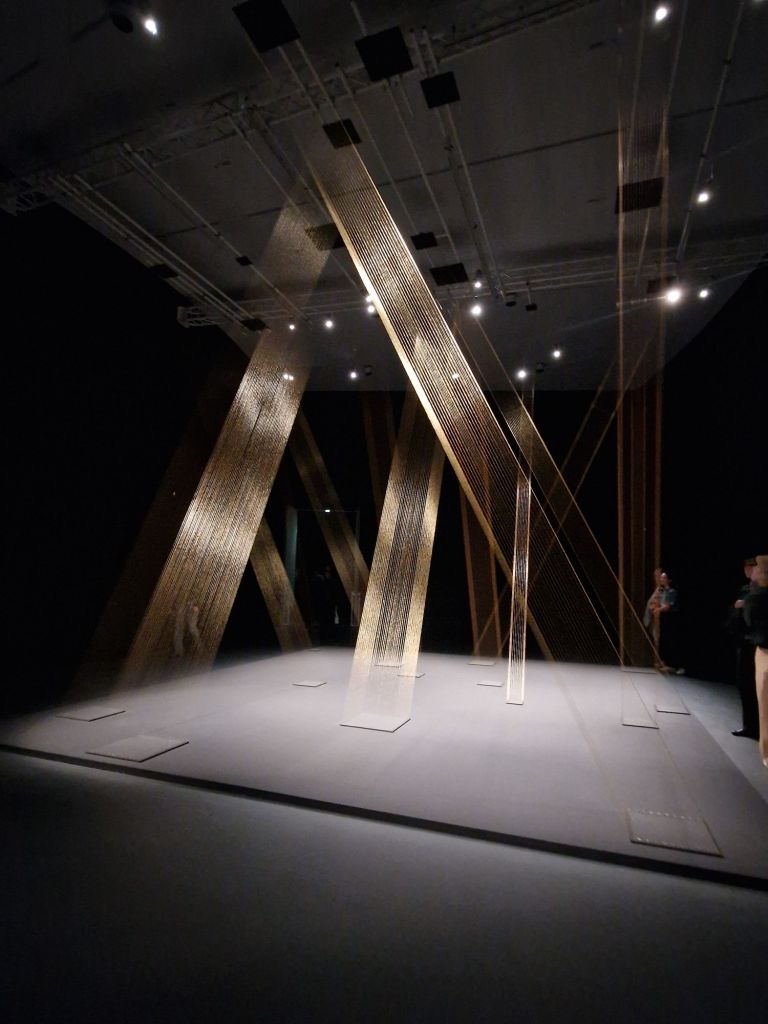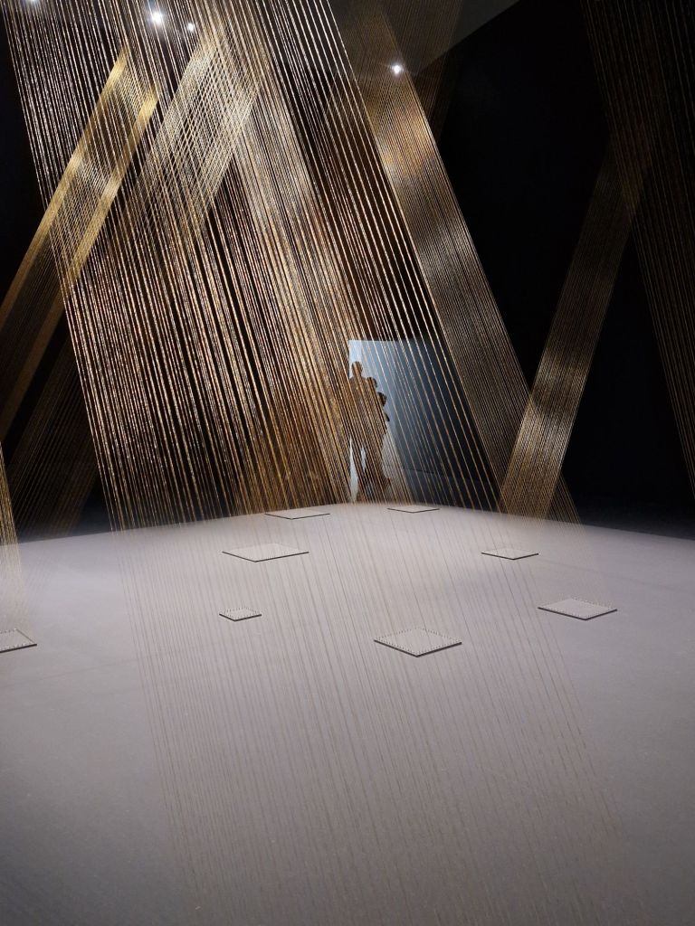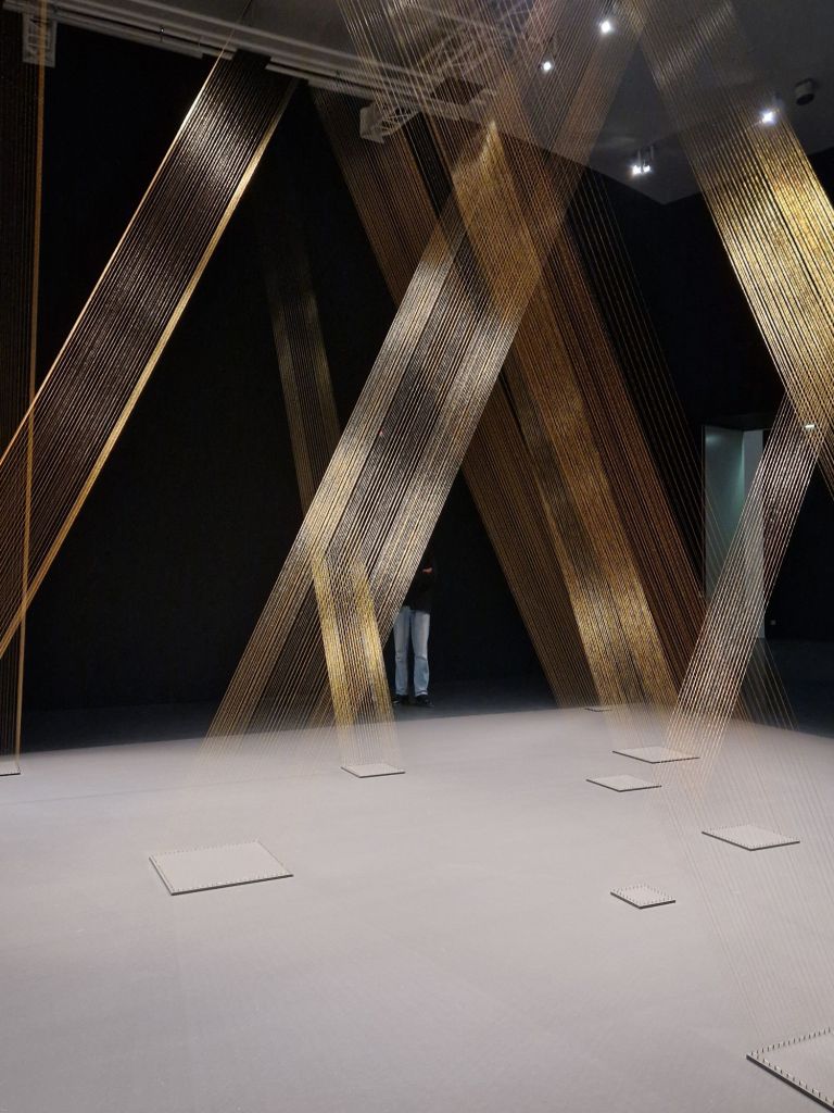 בחדר אחר וחשוך, האמנית טוותה חוטי זהב ארוכים עשויים עור, שנמתחו מהרצפה אל התקרה ויצרו קווי עור אלכסוניים בחלל. הקשר בין תאורה, בד, ומרחב נולד במיצב מינימלי ביותר, שמזמין את המבקרים להתרשם מהקלות שבה החלל מתמלא משמעות דרך אלמנט דמוי נול מסורתי.