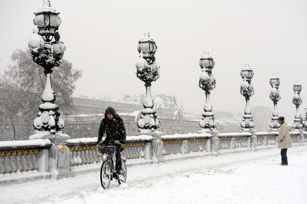 A man rides his bicycle on the snow-covered Alexandre III bridge on December 8, 2010 in Paris, as snow goes on falling over. Heavy snow shut Paris Charles de Gaulle-Roissy airport today and forced the operators of the Eiffel Tower to close the landmark tourist attraction, officials said. AFP PHOTO BERTRAND GUAY (Photo credit should read BERTRAND GUAY/AFP/Getty Images)
